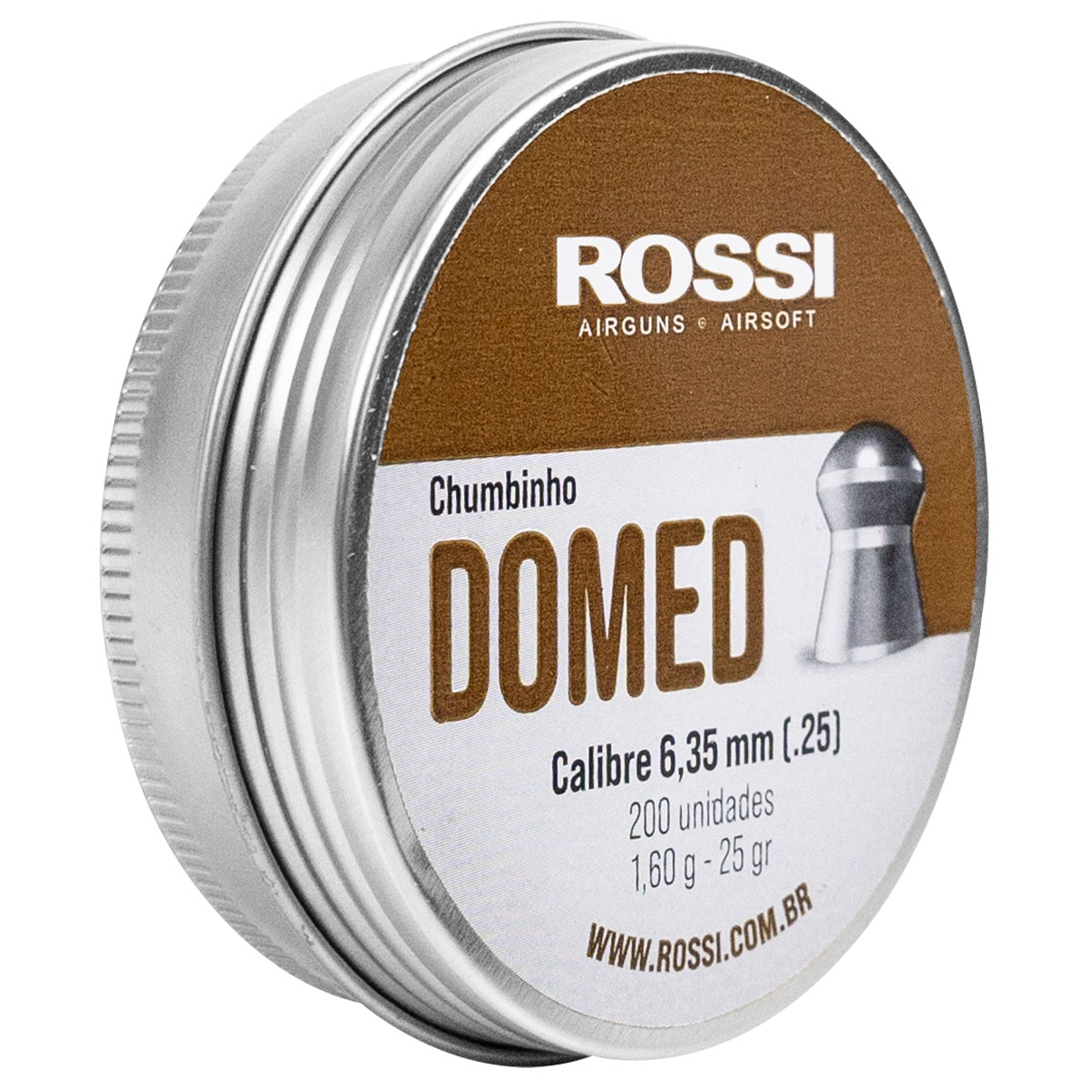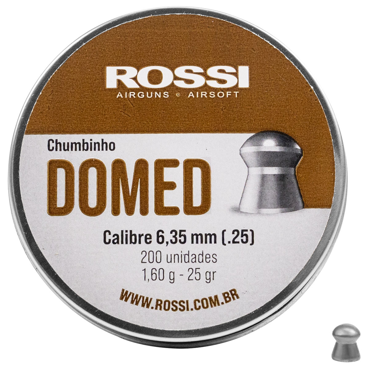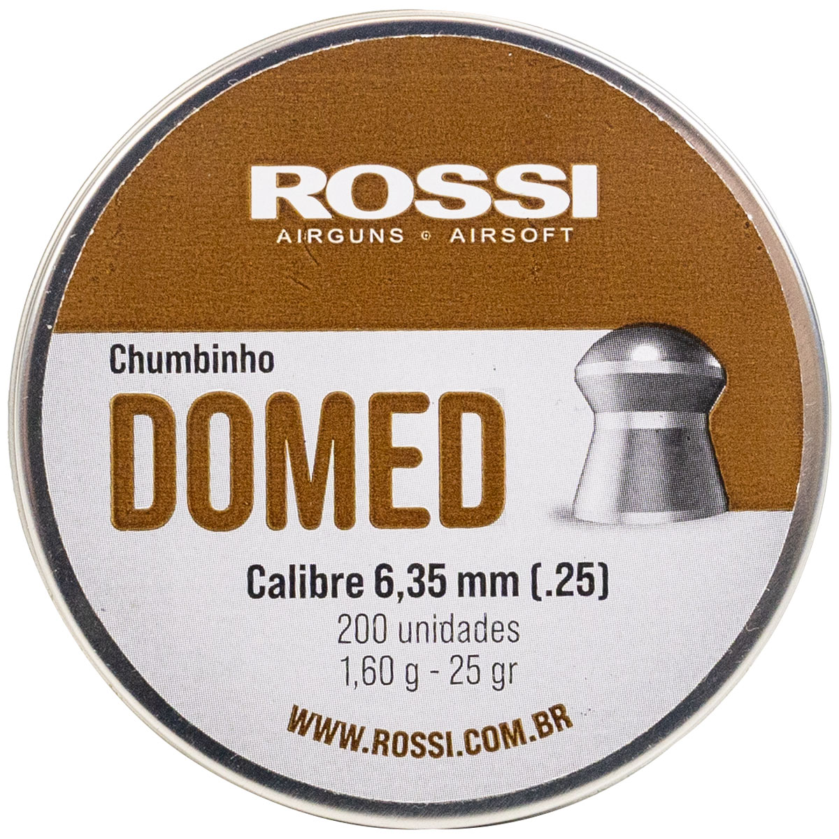 O Chumbinho Rossi Domed 6,35 mm entrega impacto poderoso, penetração eficiente e excelente precisão. Com ponta arredondada e peso de 1,60 g (25 gr), é ideal para carabinas de alta potência. Embalagem com 200 unidades.