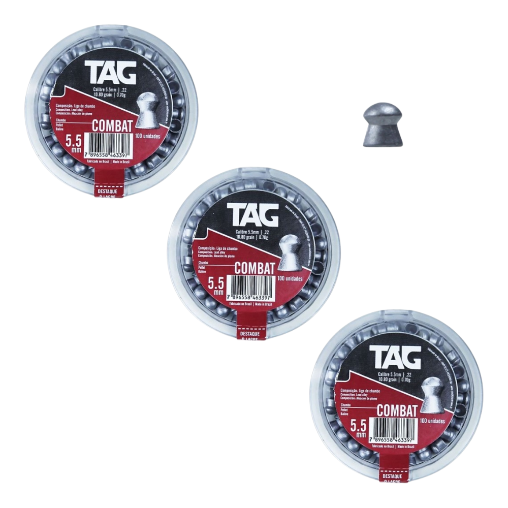 Chumbinho de alta qualidade com design exclusivo que vai oferecer alto nível aerodinâmico, entregando disparos com altíssimo poder de destruição no impacto e boa penetração.Esse chumbinho pode ser utilizado para diferentes finalidades, seja tiro em alvos de papel, alvos metálicos, latinhas, treino, etc. O chumbinho TAG Combat é fabricado por sistema de injeção, sendo um chumbinho equilibrado, sólido e com ótimo desempenho em armas de pressão de alta potência.Cada chumbinho pesa 10.80 grains que equivalem a 0.70 gramas.Possui design de cabeça redonda com saia lisa.Embalagem de fácil manuseio, transporte e armazenamento. São 100 chumbinhos para carabinas de pistolas de pressão no calibre 5.5 mm (.22).
