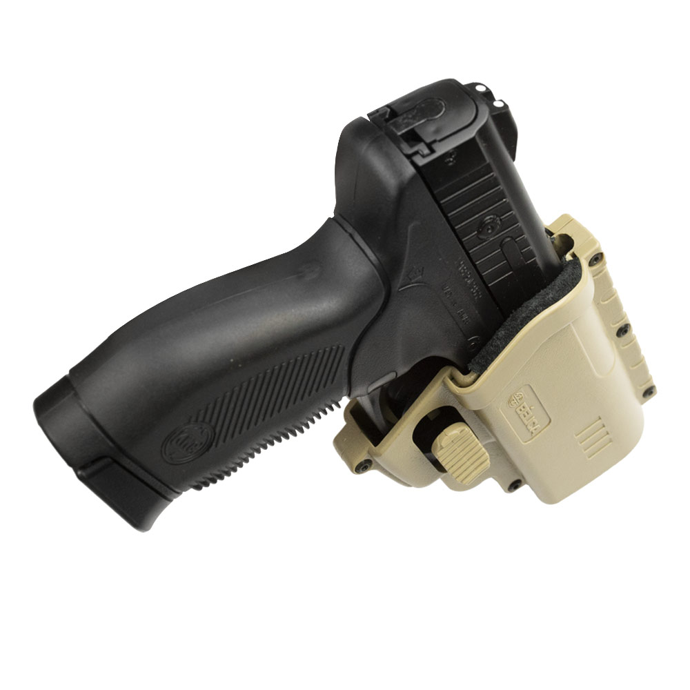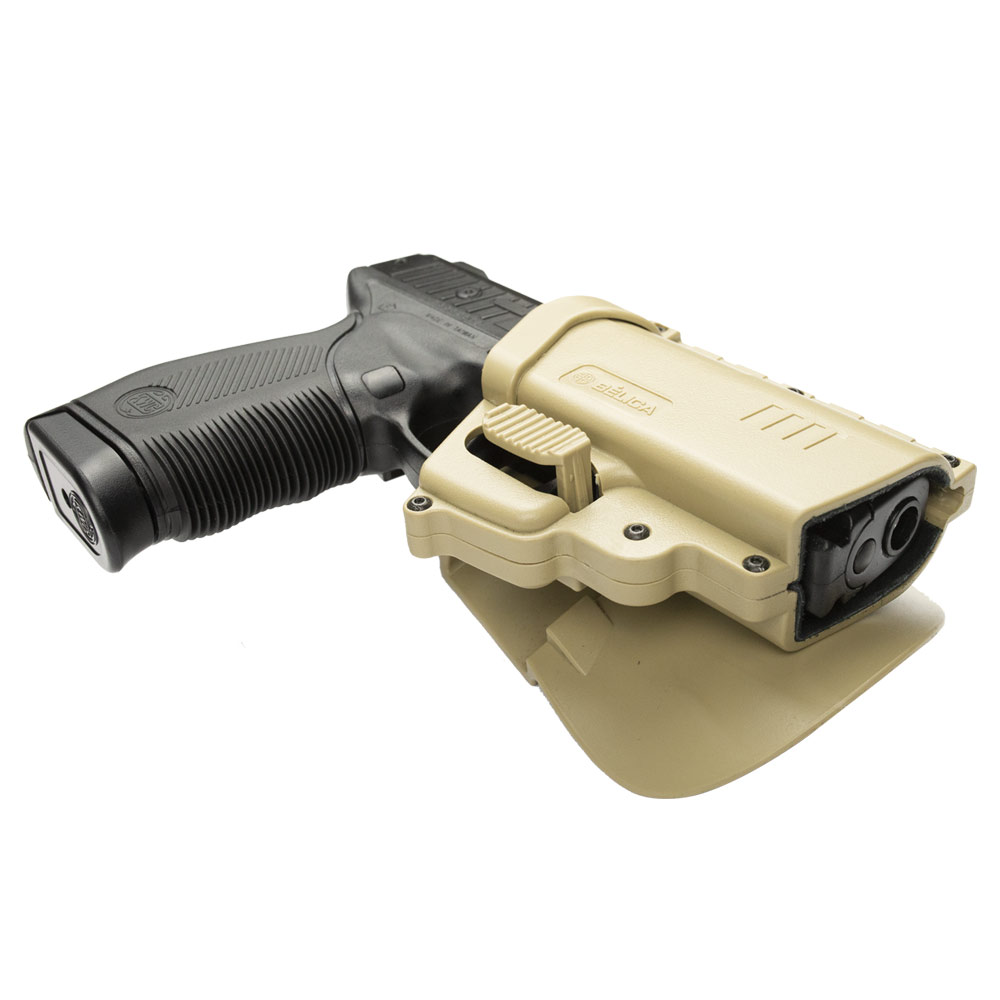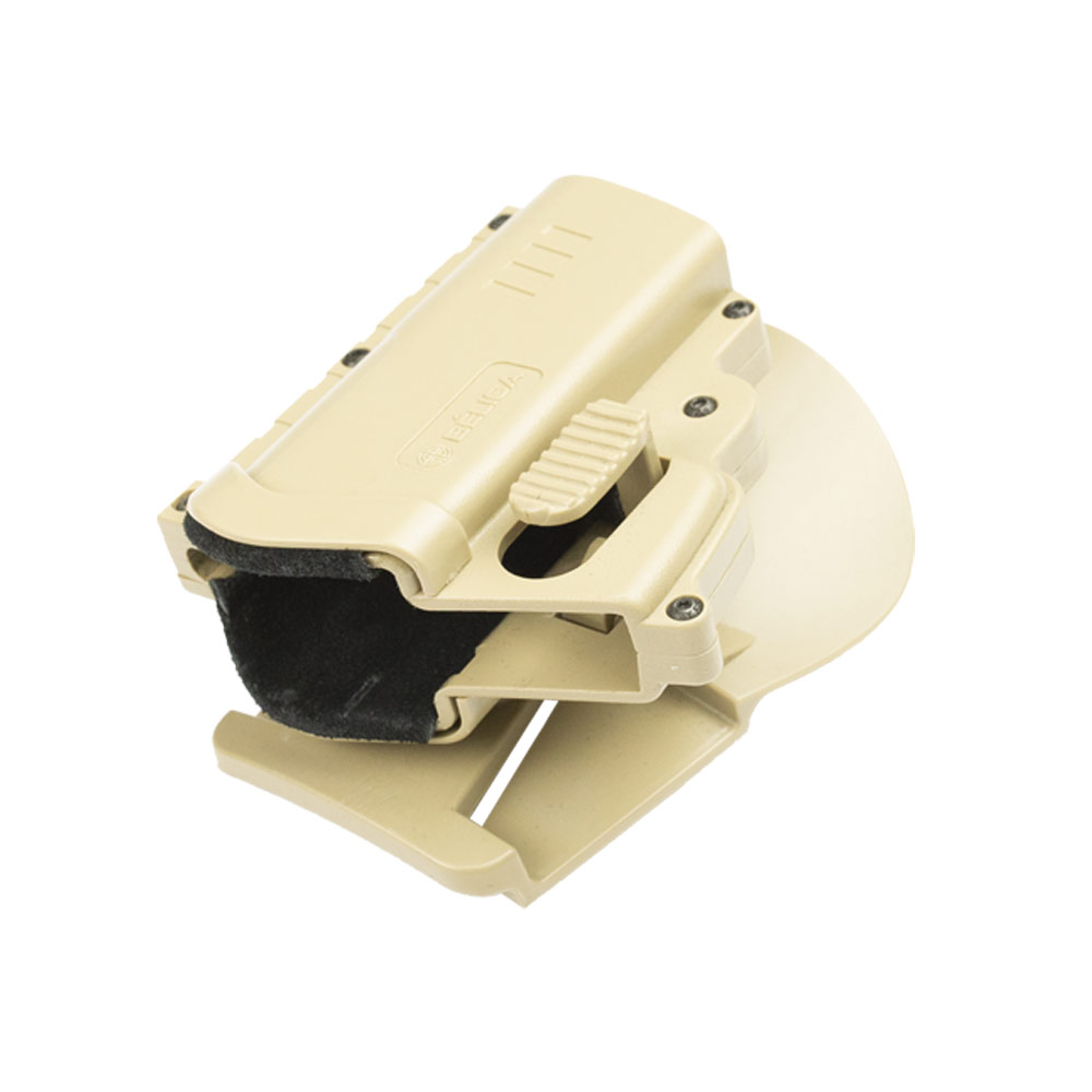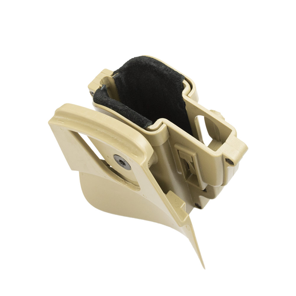 Modelo na cor Coyote, tem um lindo visual e alta qualidade, com fixador de cinto por catraca rotativa. Pode ser fixado em outras bases compatíveis com catraca.