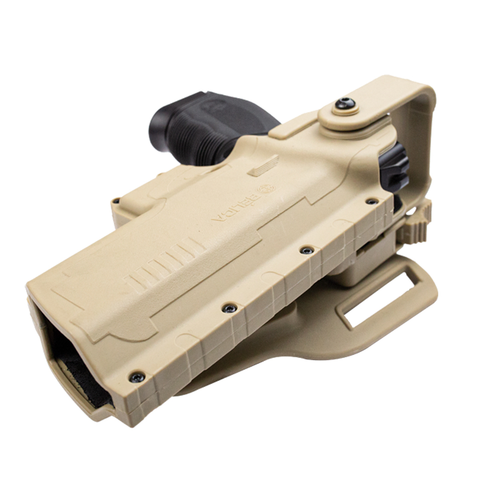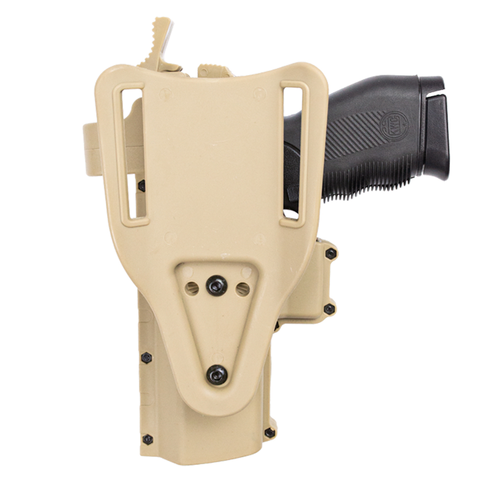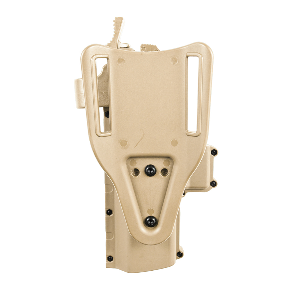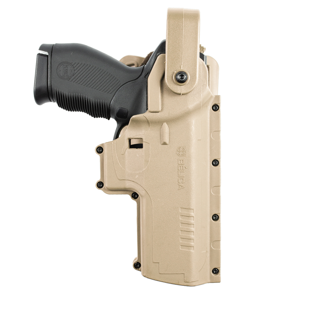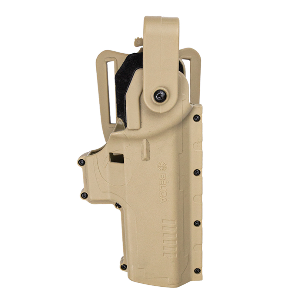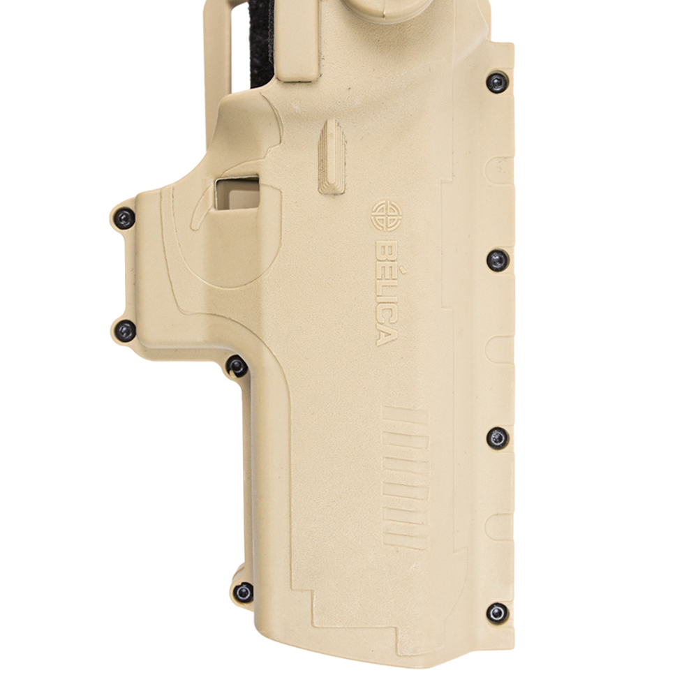 Coldre para Pistola, de cintura, Coyote, fabricado pela Bélica em polímero de alta densidade e revestimento interno em couro que contribui para diminuir o atrito entre o coldre a pistola. Conta passador para cinto de até 55mm.
