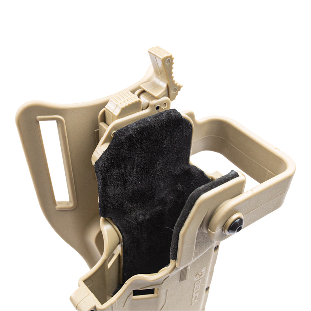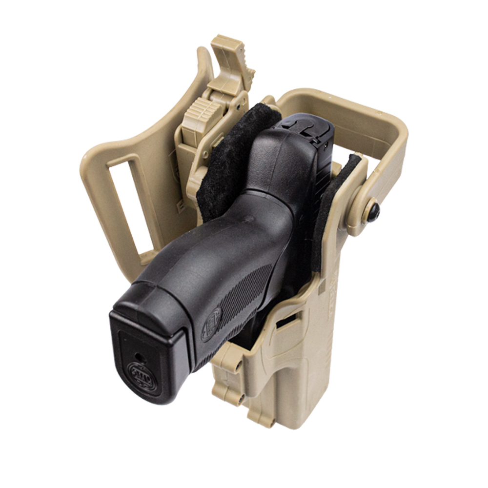 Travamento Dual Lock System para evitar o destravamento indevido do coldre durante o uso.