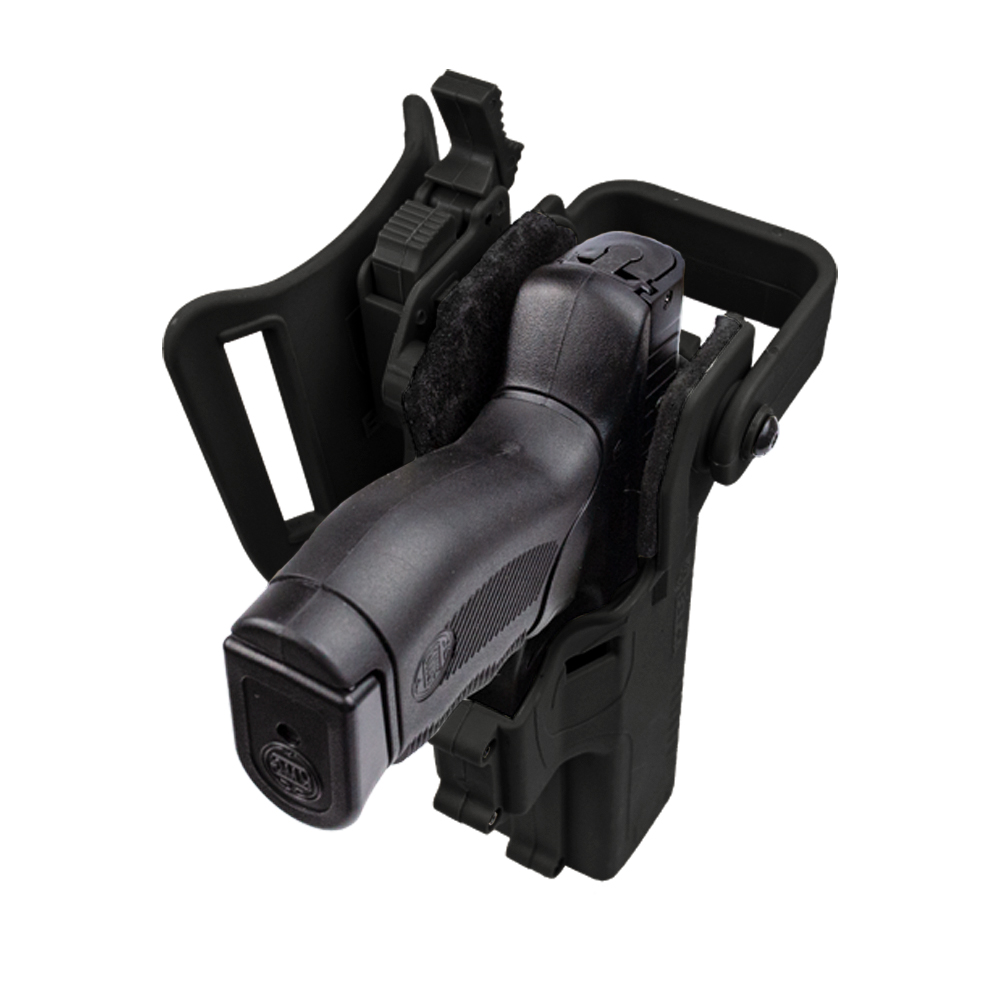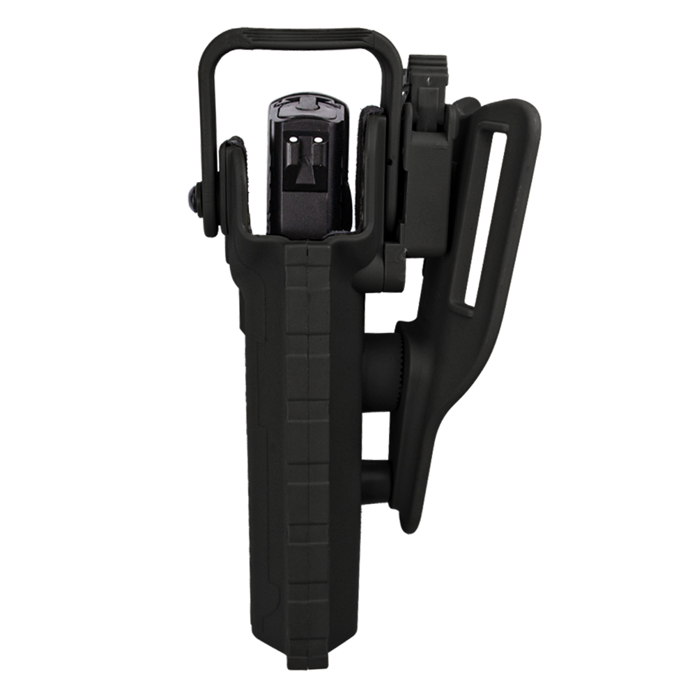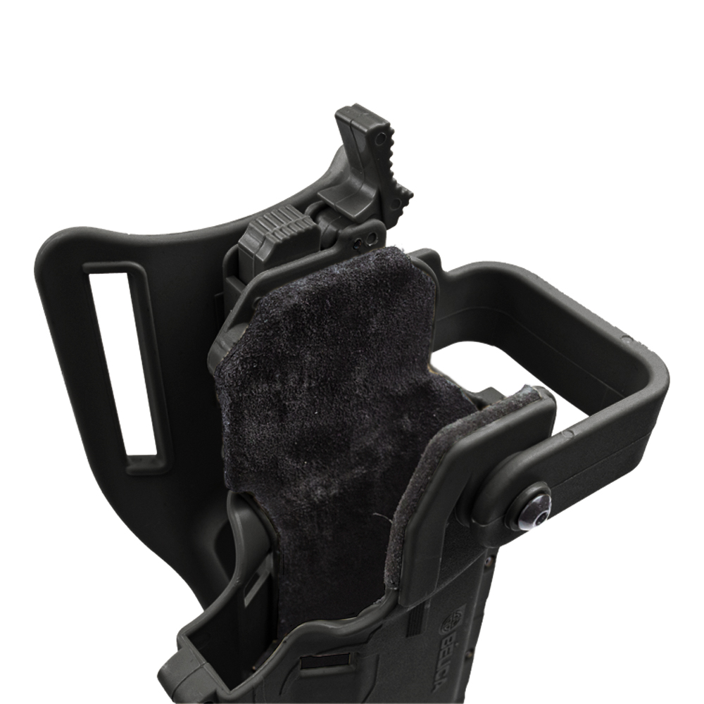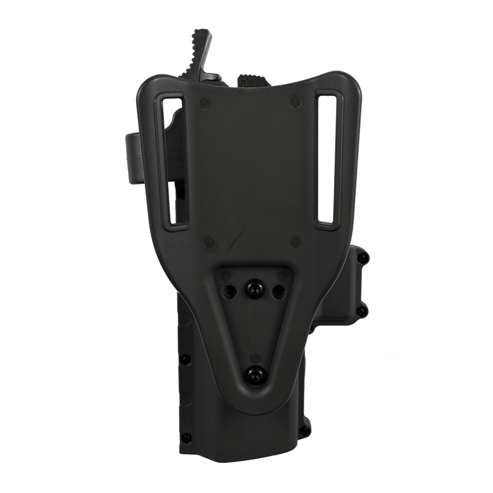 Tem 3 regulagens de angulação em sua base, que torna o manuseio da pistola muito mais fácil. Permite que o coldre seja fixado em outras bases compatível, como base de perna.
