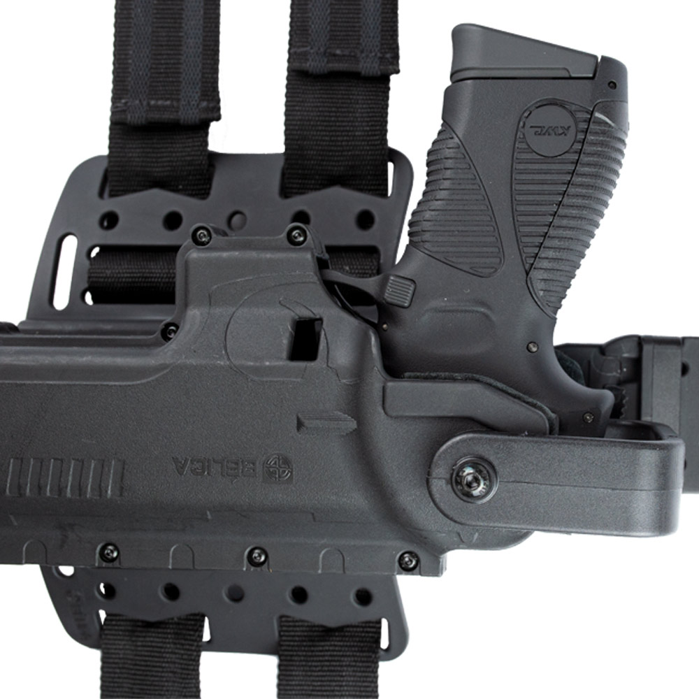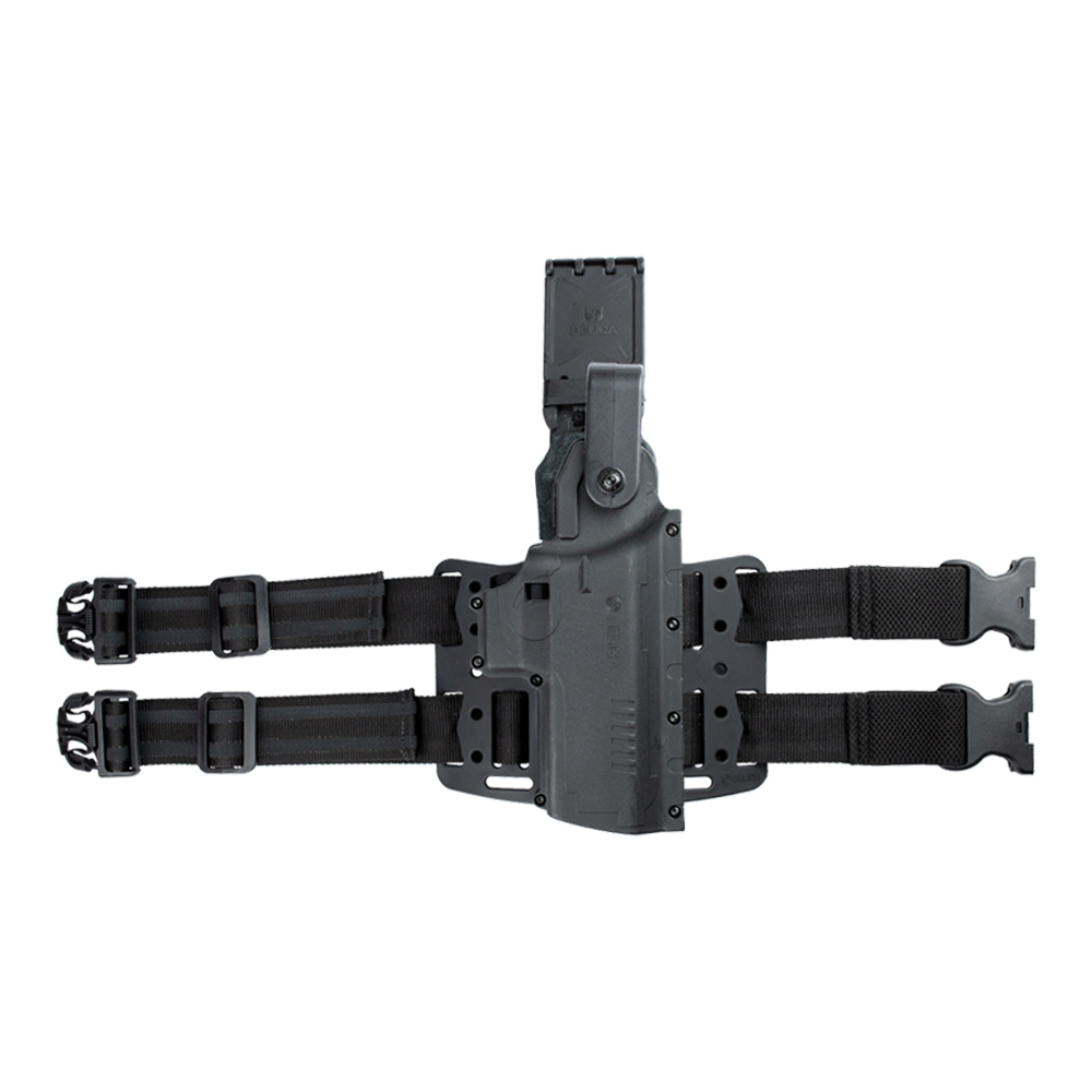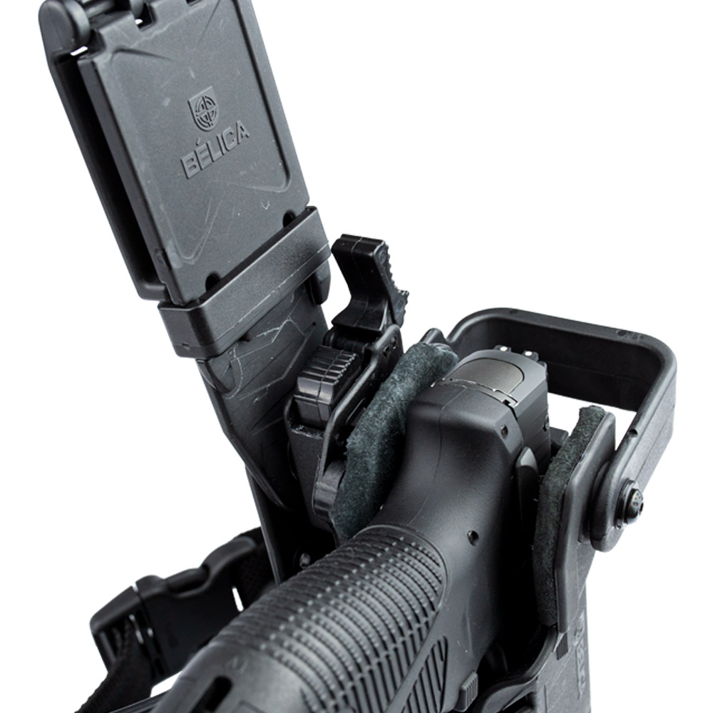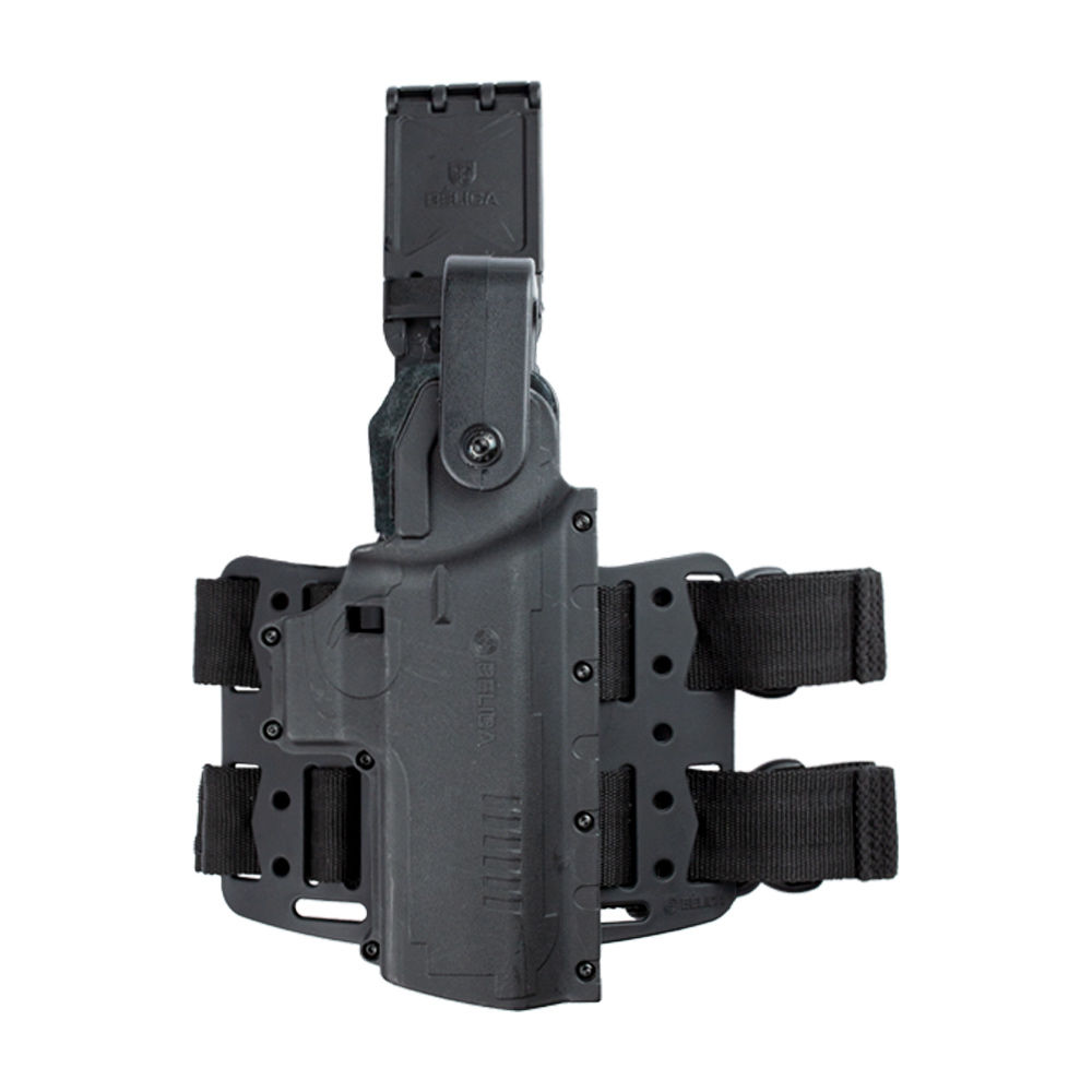 Coldre Bélica com plataforma de Perna, na cor preta, fabricado em polímero de alta densidade.