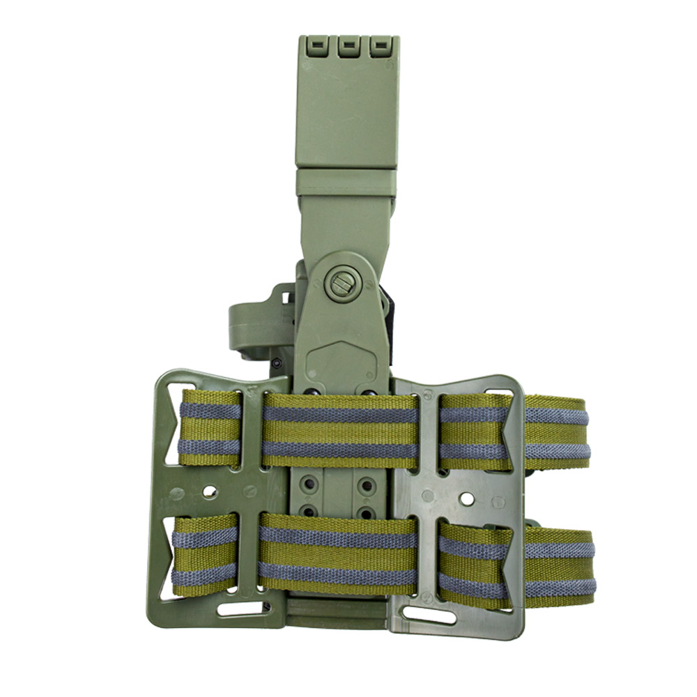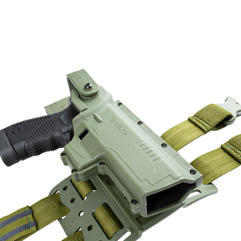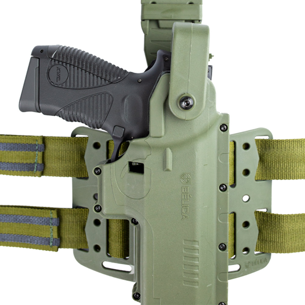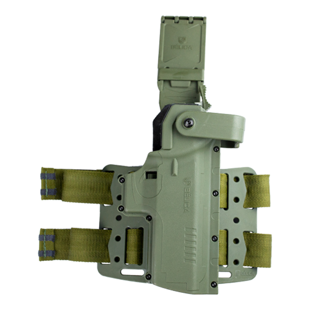 Hammer Pro II é um coldre com plataforma de perna na cor verde fabricado pela Bélica em polímero de alta densidade com revestimento interno em couro legítimo.