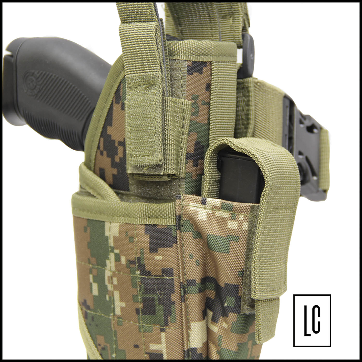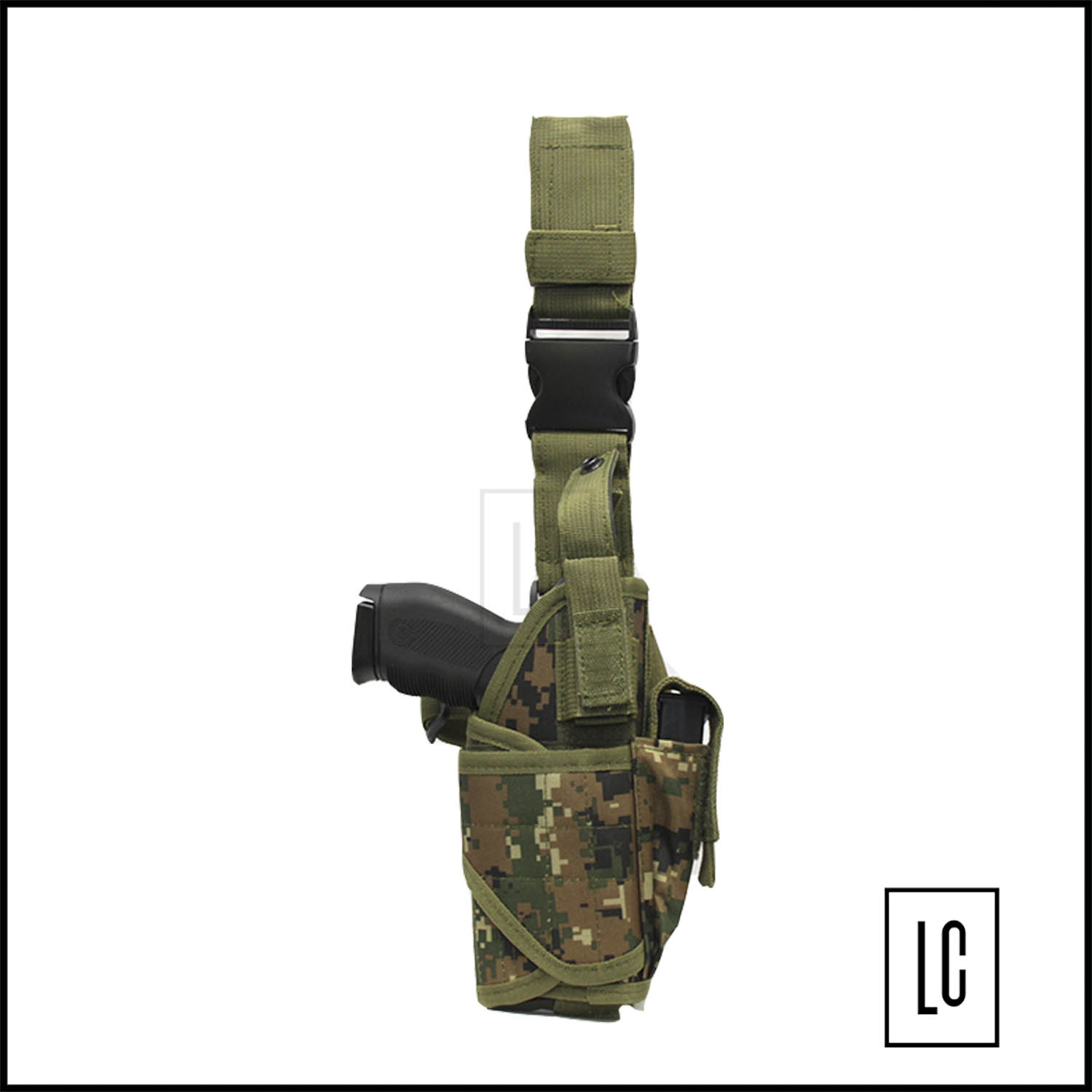 Fabricado em nylon de alta qualidade, possui alça para cintos com ajustes e velcros para ajuste na fixação nas pernas.