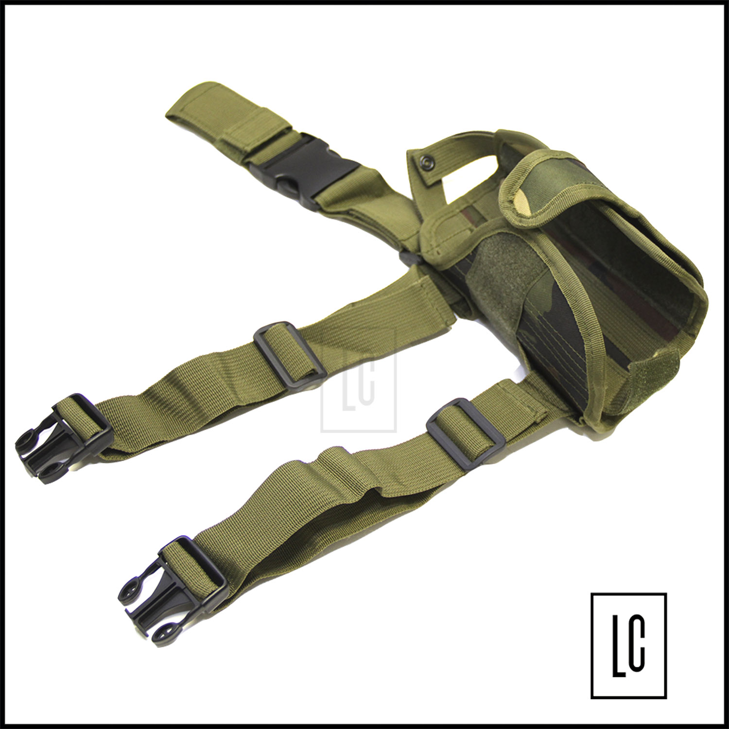 Fabricado em nylon de alta qualidade, possui alça para cintos com ajustes velcros para ajuste na fixação nas pernas.