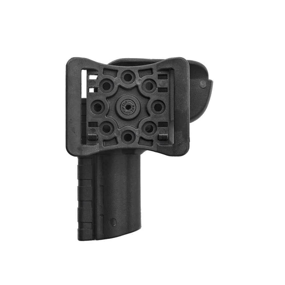 Catraca rotativa que além de permitir ajustar a angulação do revólver, também permite utilizar em outras bases compatíveis com a catraca como plataforma de coxa, adaptadores speed e adaptadores strike 3 e 4 pontas.