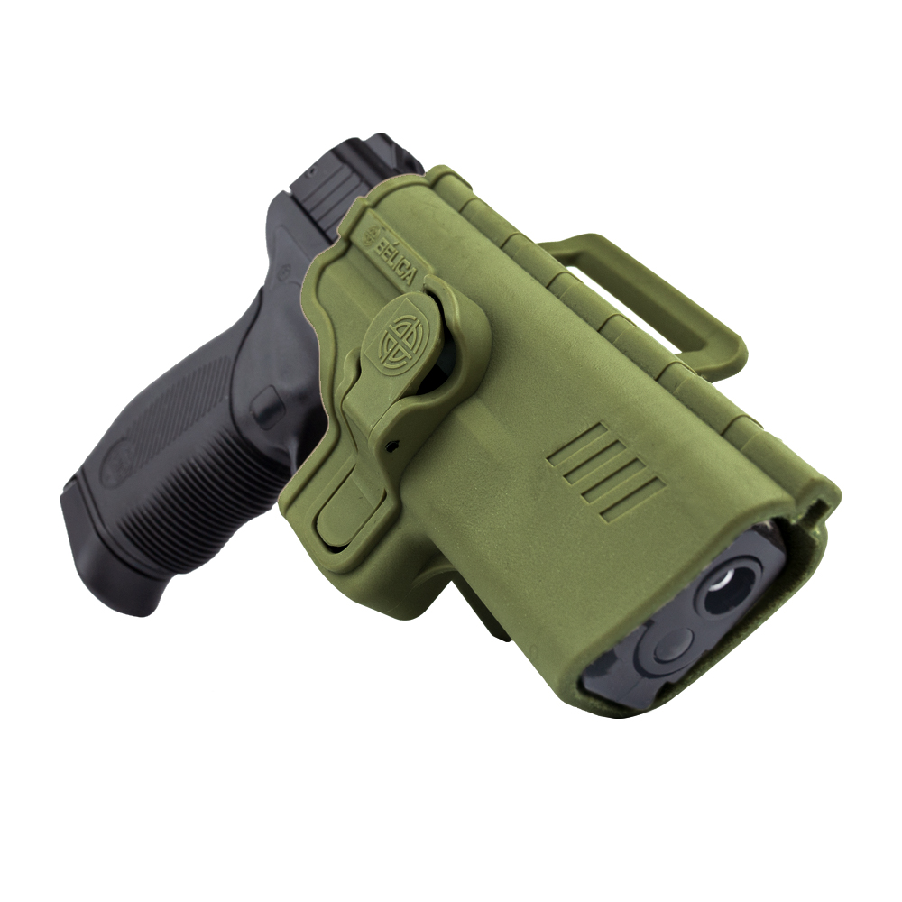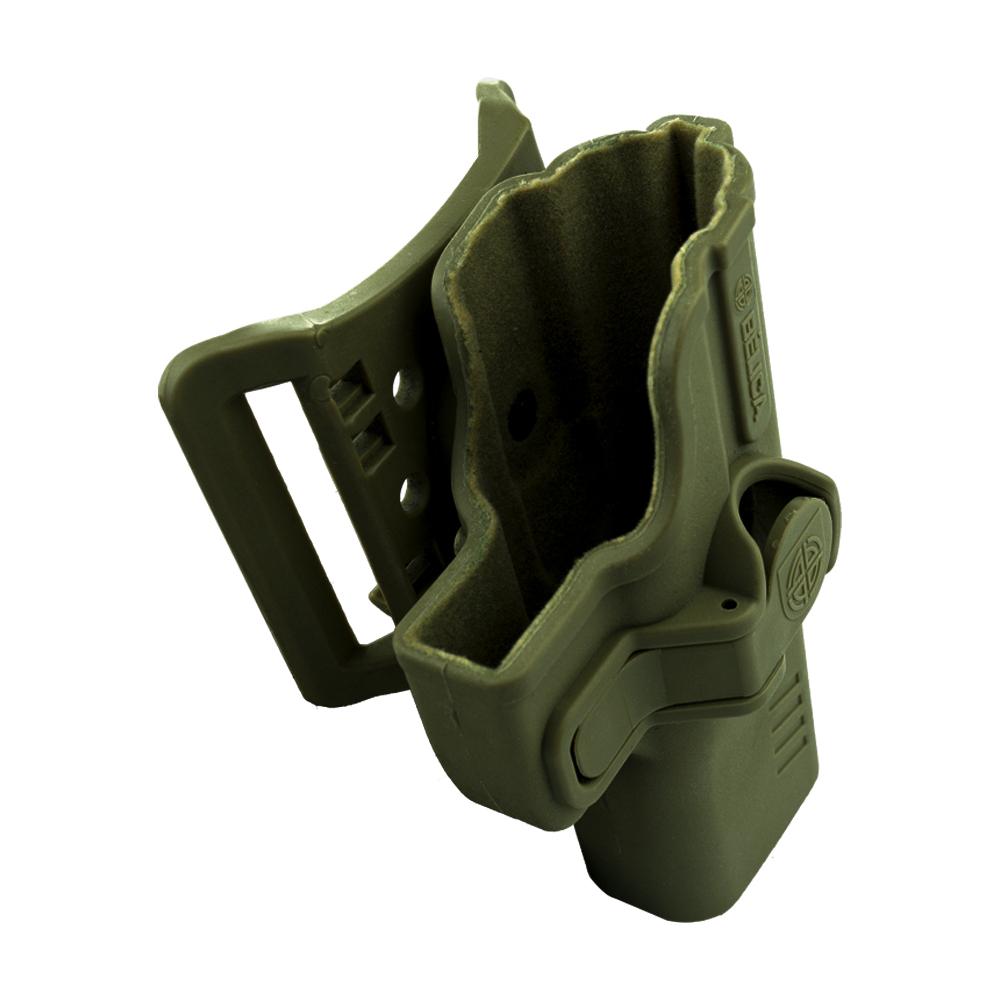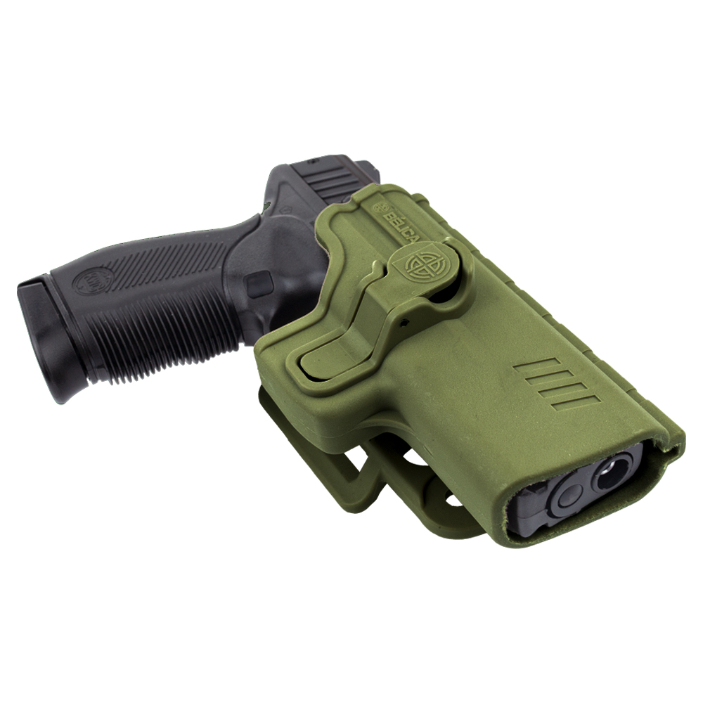 Coldre Bélica Verde SR1 Pro, fabricado em polímero de alta resistência. Possui passador de cinto.