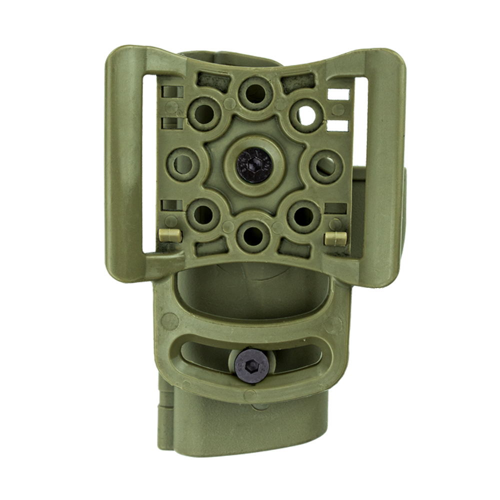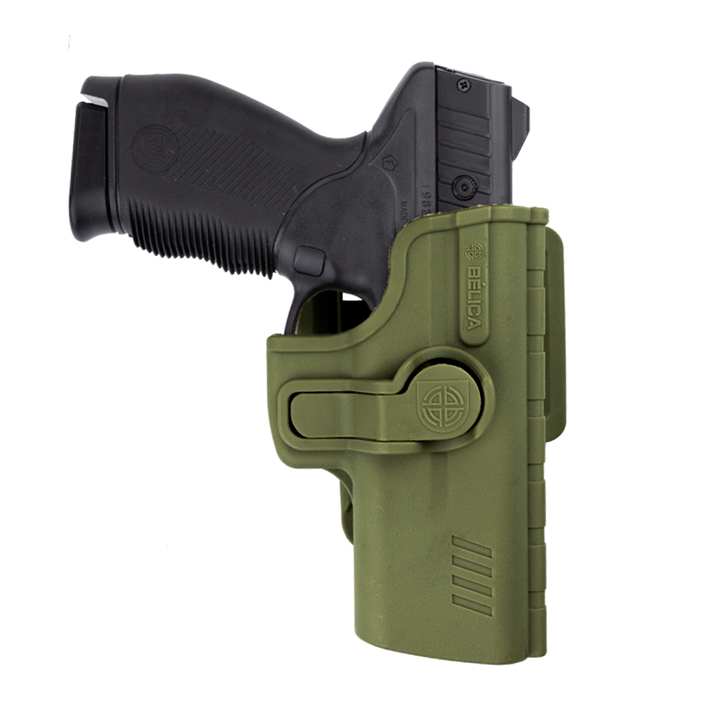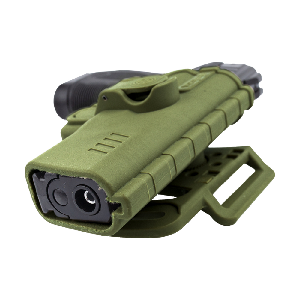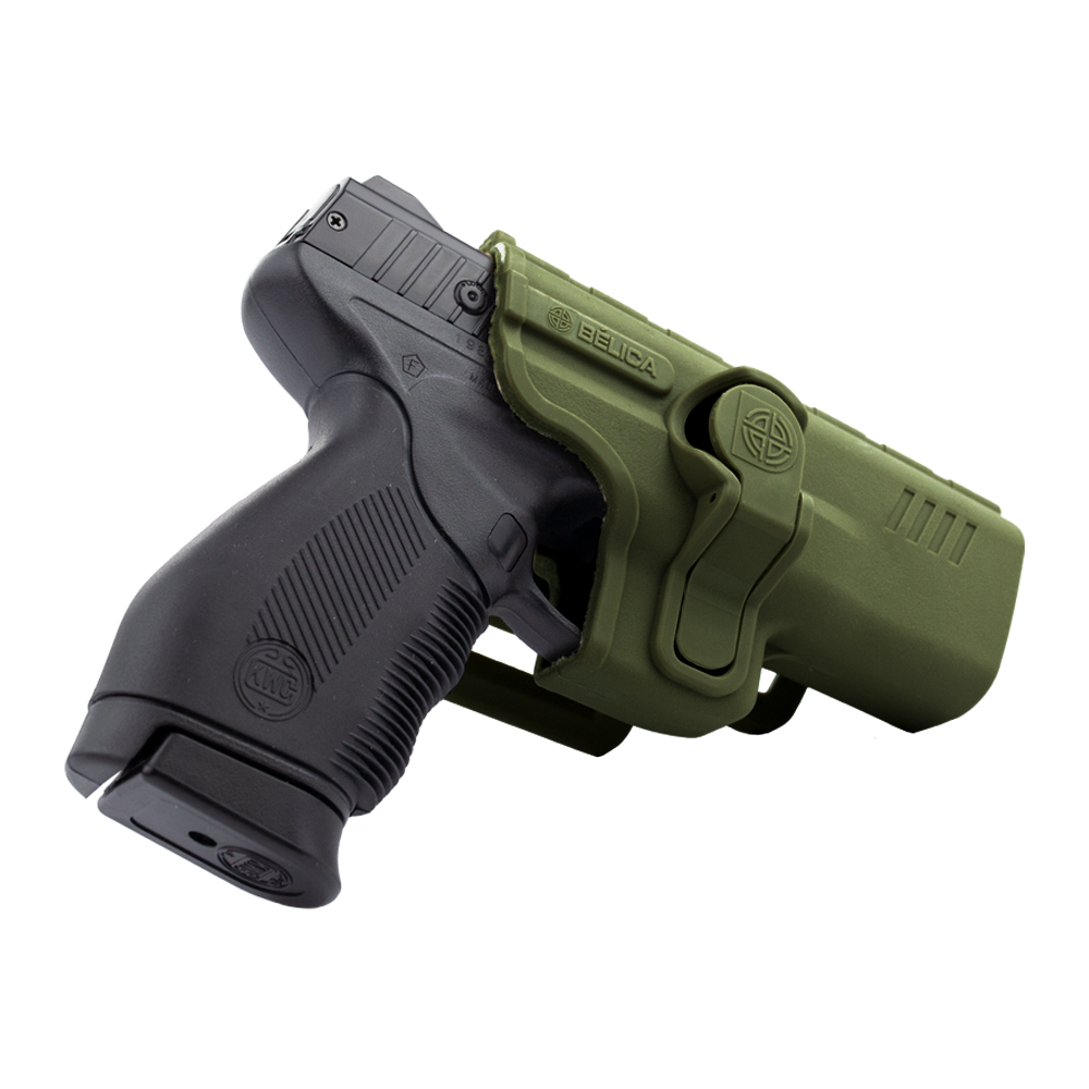 Coldre Bélica Verde SR1 Pro, fabricado em polímero de alta resistência. Possui passador de cinto.