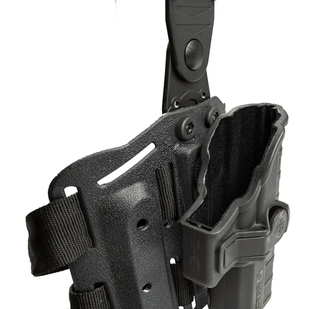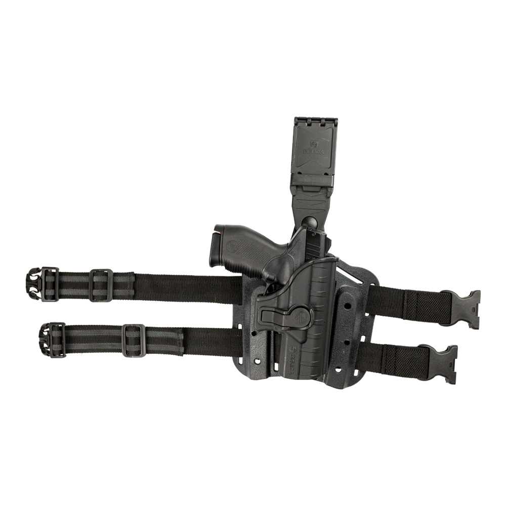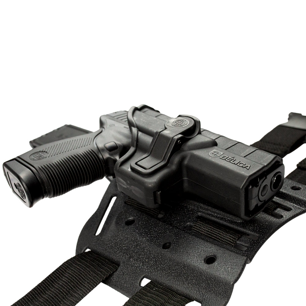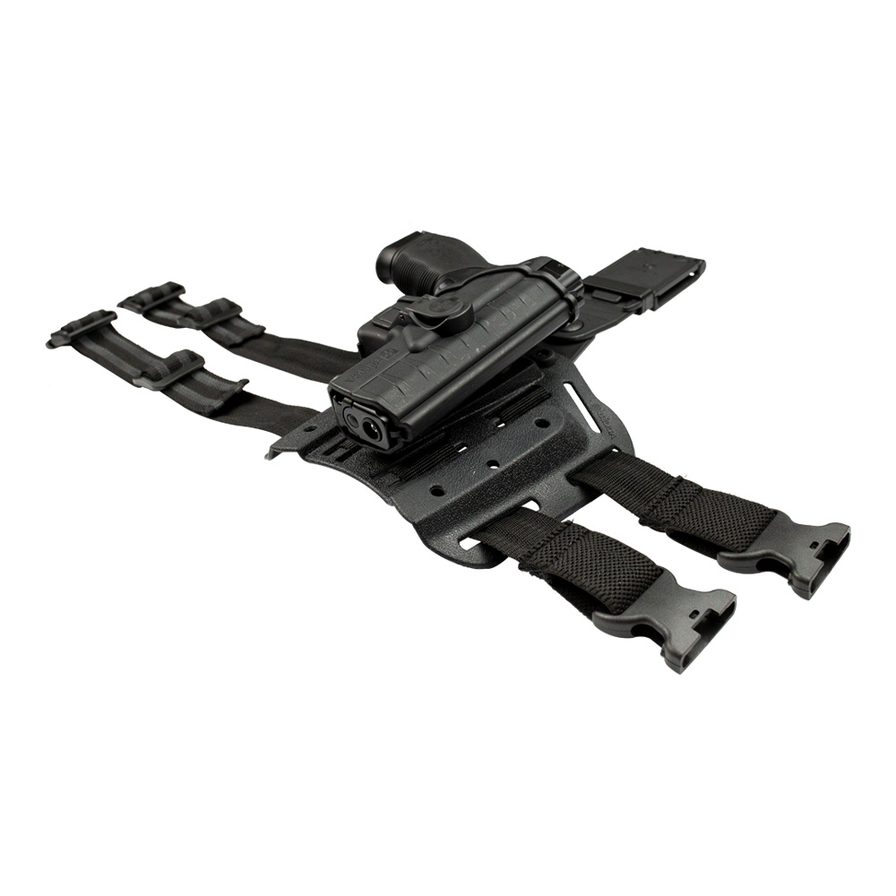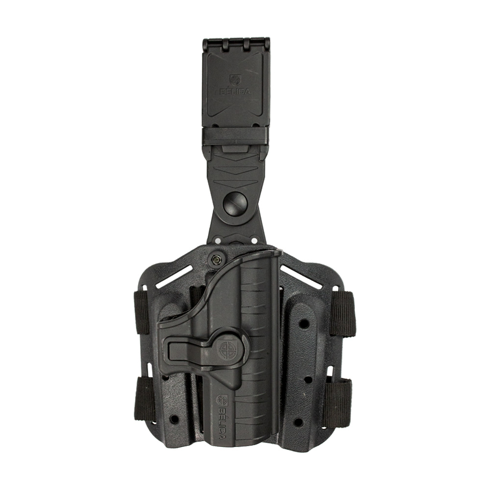 Coldre Bélica com Plataforma de Perna Striker II, fabricado em polímero de alta resistência e com revestimento interno em flocagem. É fabricado em um único bloco, sem emendas.Desenvolvido com base nas medidas das Pistolas Taurus TS9 e Beretta APX. Possui adaptador de tamanho que permite acoplar pistolas maiores como a TS9 e outras.