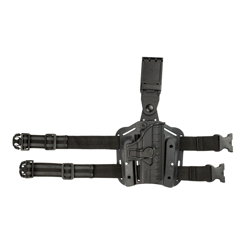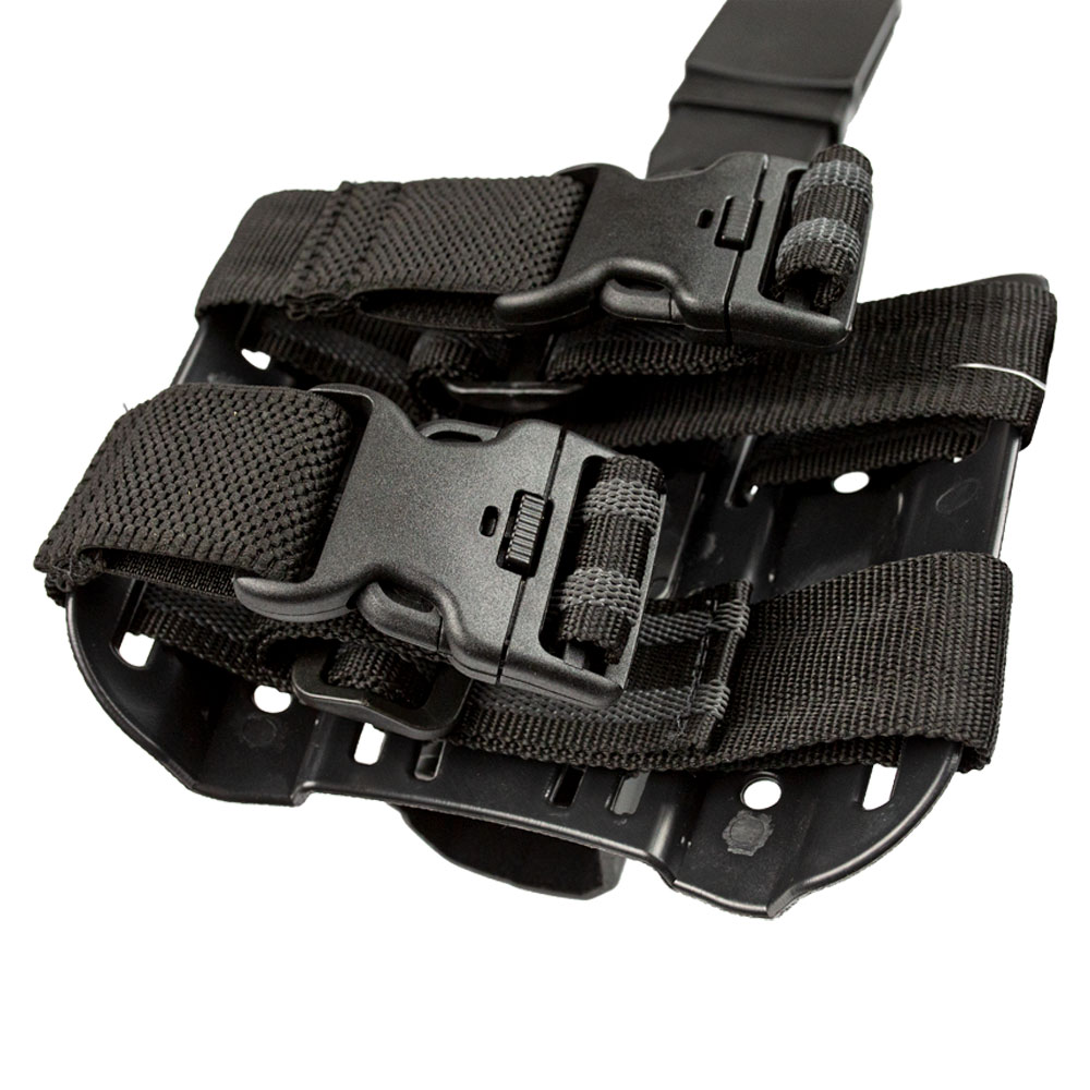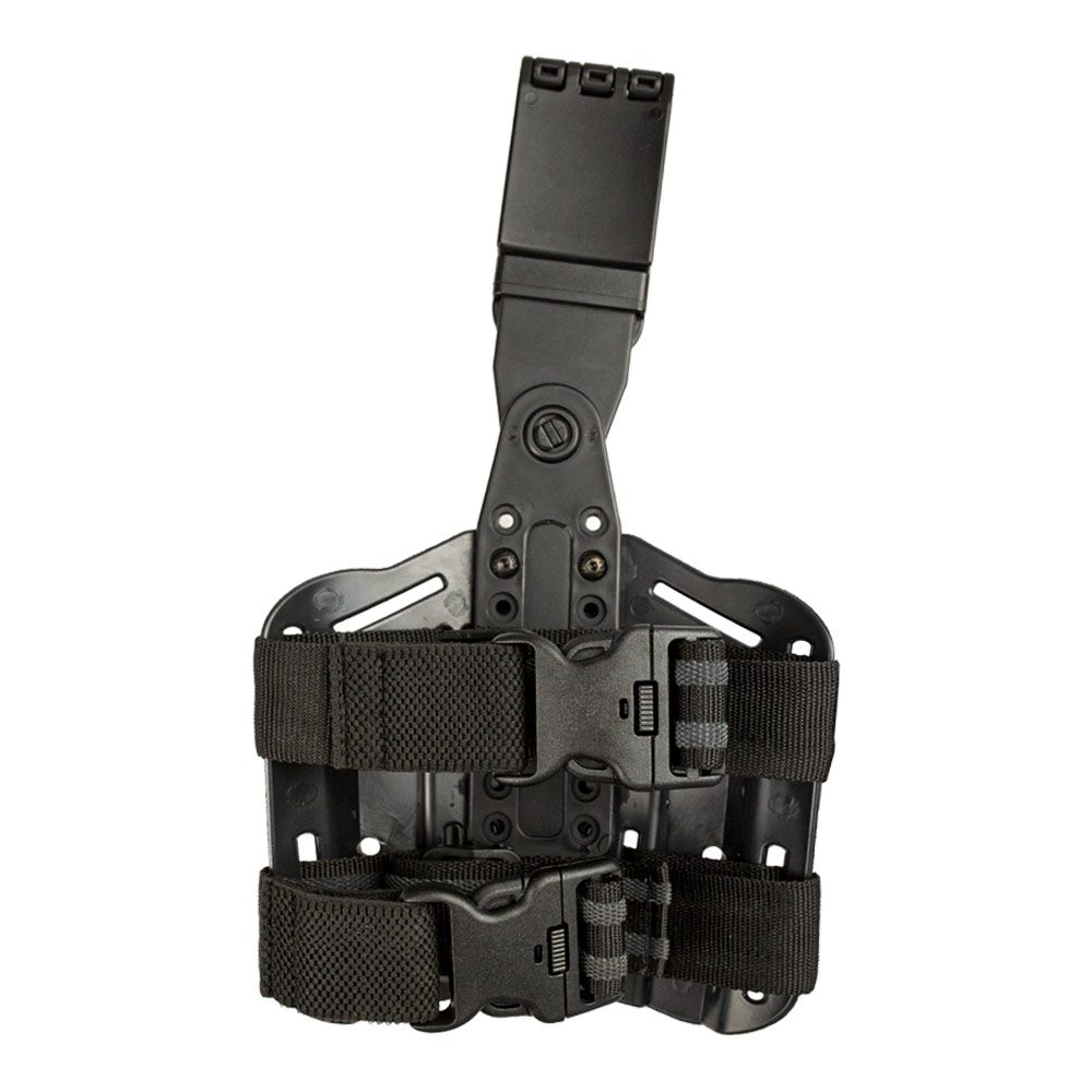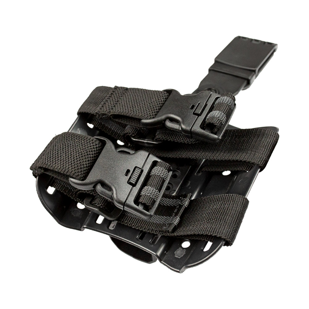 Esse coldre Striker utiliza plataforma de perna Belt-Lock Spin que consiste em um conjunto formado com a alça de fixação para cinto com sistema rotativo. Possui trava para liberação do cinto de guarnição com 7 níveis de regulagem. É uma plataforma super confortável, flexível e acima de tudo resistente! Ela segue a anatomia da perna, vestindo de forma totalmente confortável. Possui também fivelas com trava tripla e fitas emborrachadas, altamente aderentes que além de proporcionar maior segurança, também evita que a plataforma altere a posição.