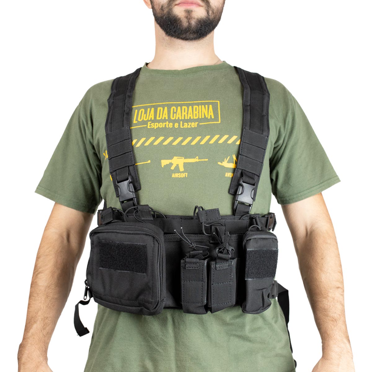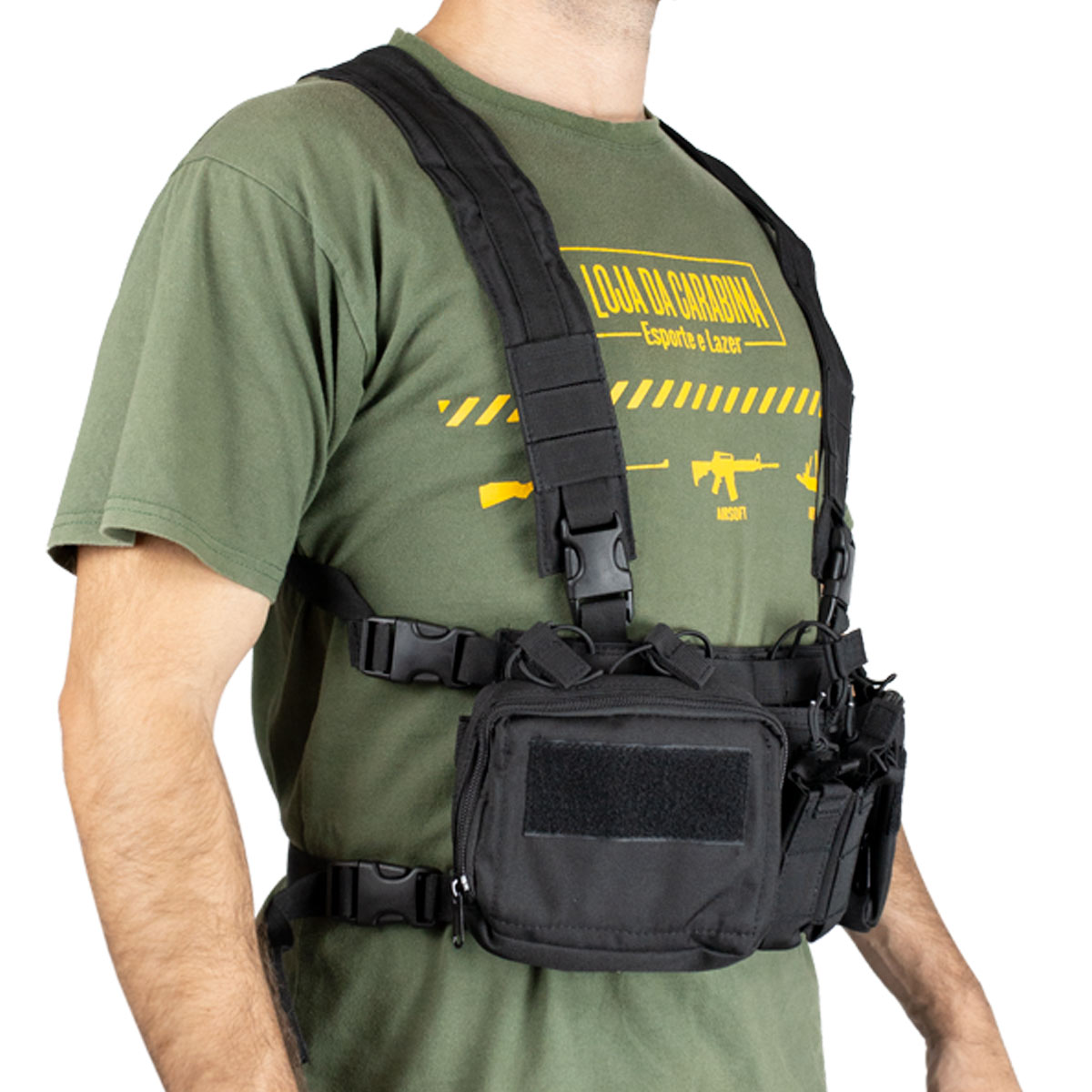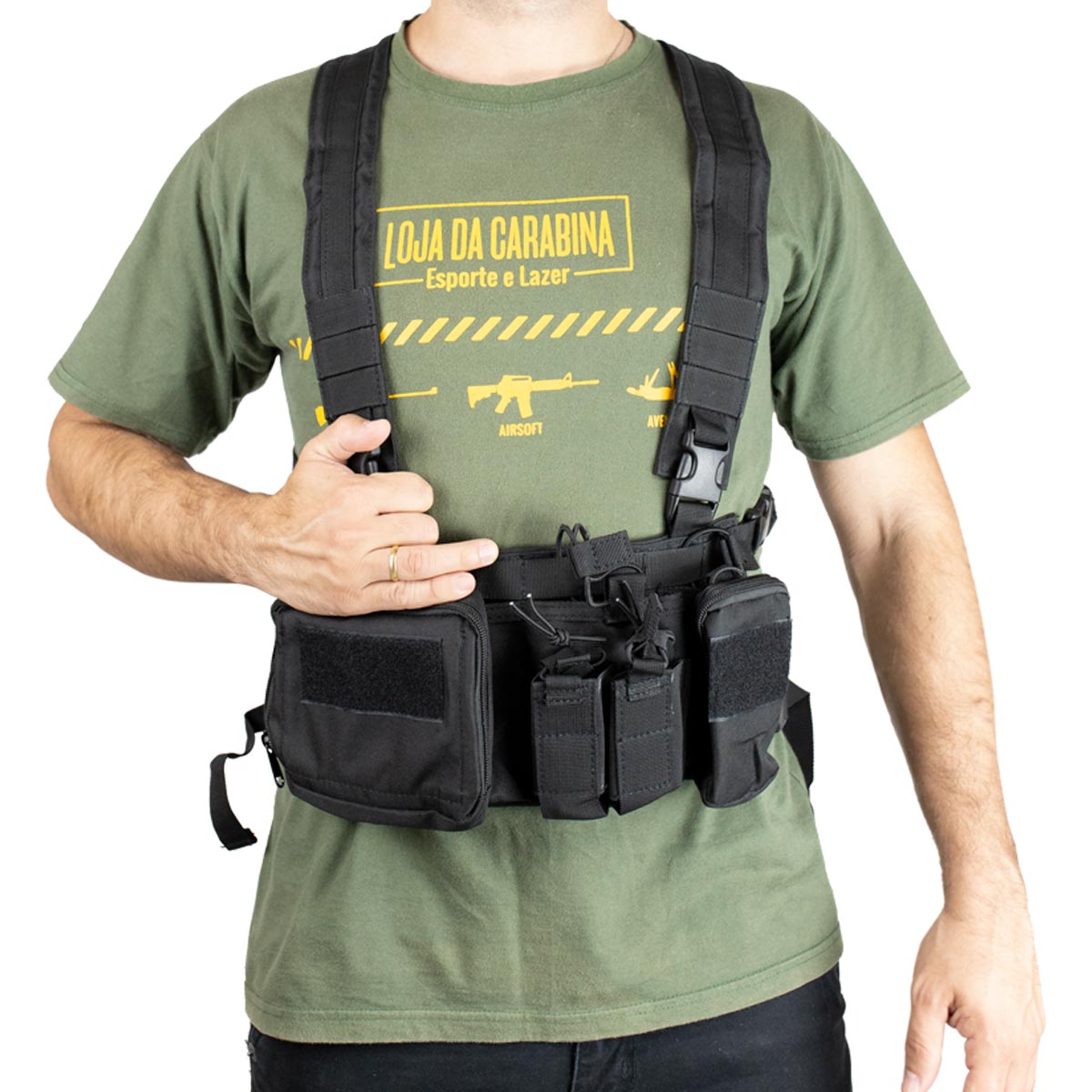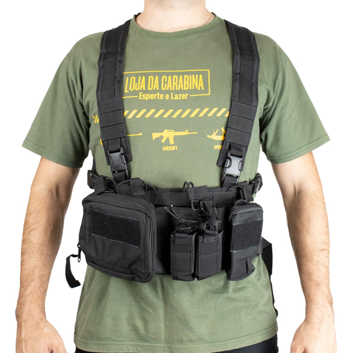 Colete com 8 bolsos para magazines, kit médico e utilidades.
