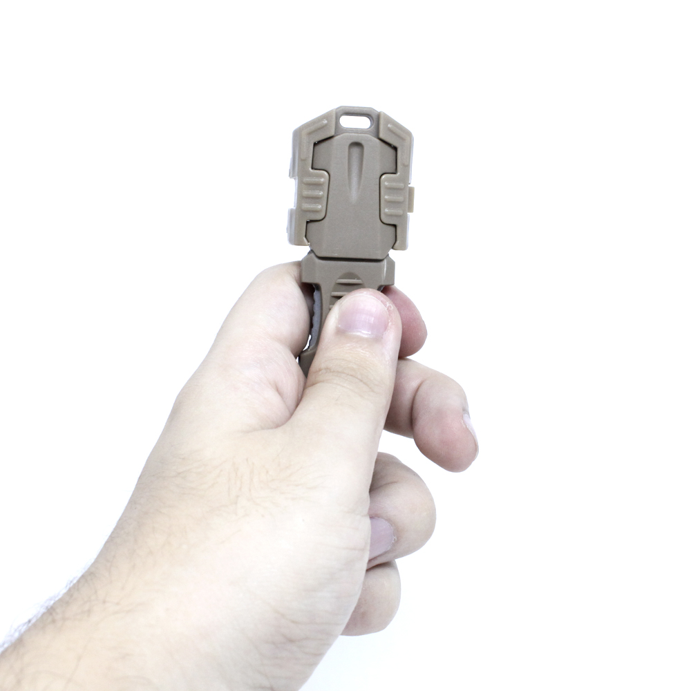 Produzida em aço inoxidável e cabo fabricado em polímero flexível. Pequena e portátil, sendo ideal para coletes e mochilas que tenham sistema molle.