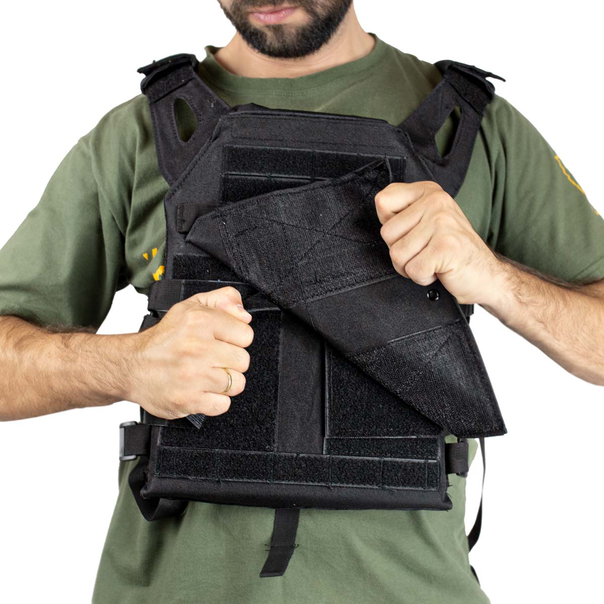 O colete conta com velcro paras patches ou itens ao gosto do usuário.
