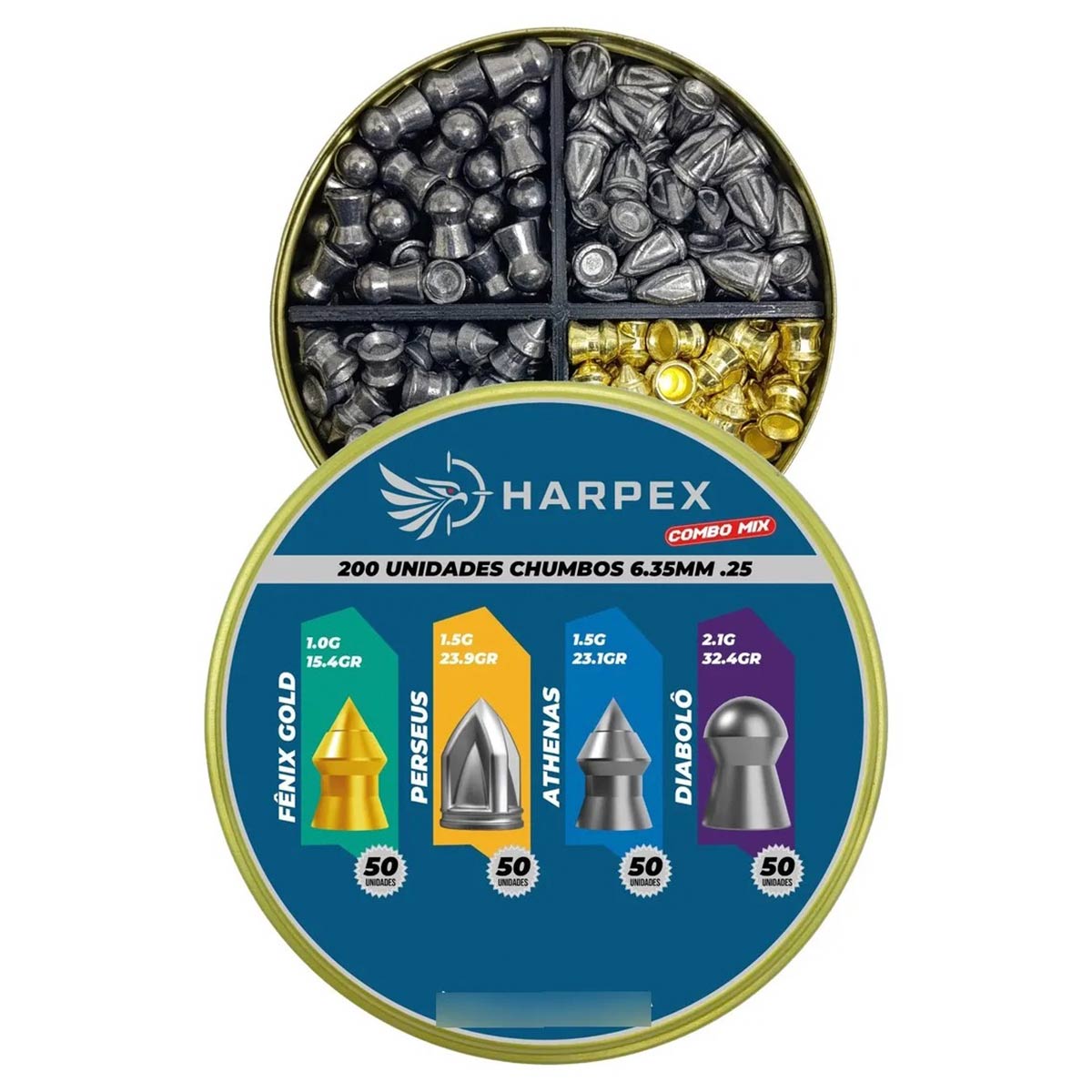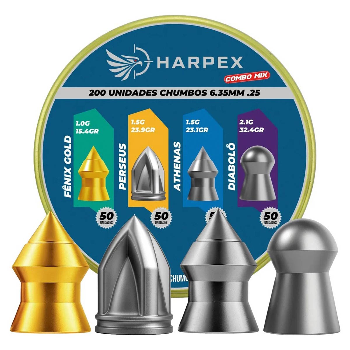 O Combo Mix Harpex 6.35mm com 200 unidades foi desenvolvido para atiradores que desejam explorar o máximo potencial da sua carabina de pressão por meio da comparação entre diferentes tipos de chumbinhos. Esse kit reúne quatro modelos distintos da linha Harpex, cada um projetado com características específicas de peso, formato e comportamento balístico.