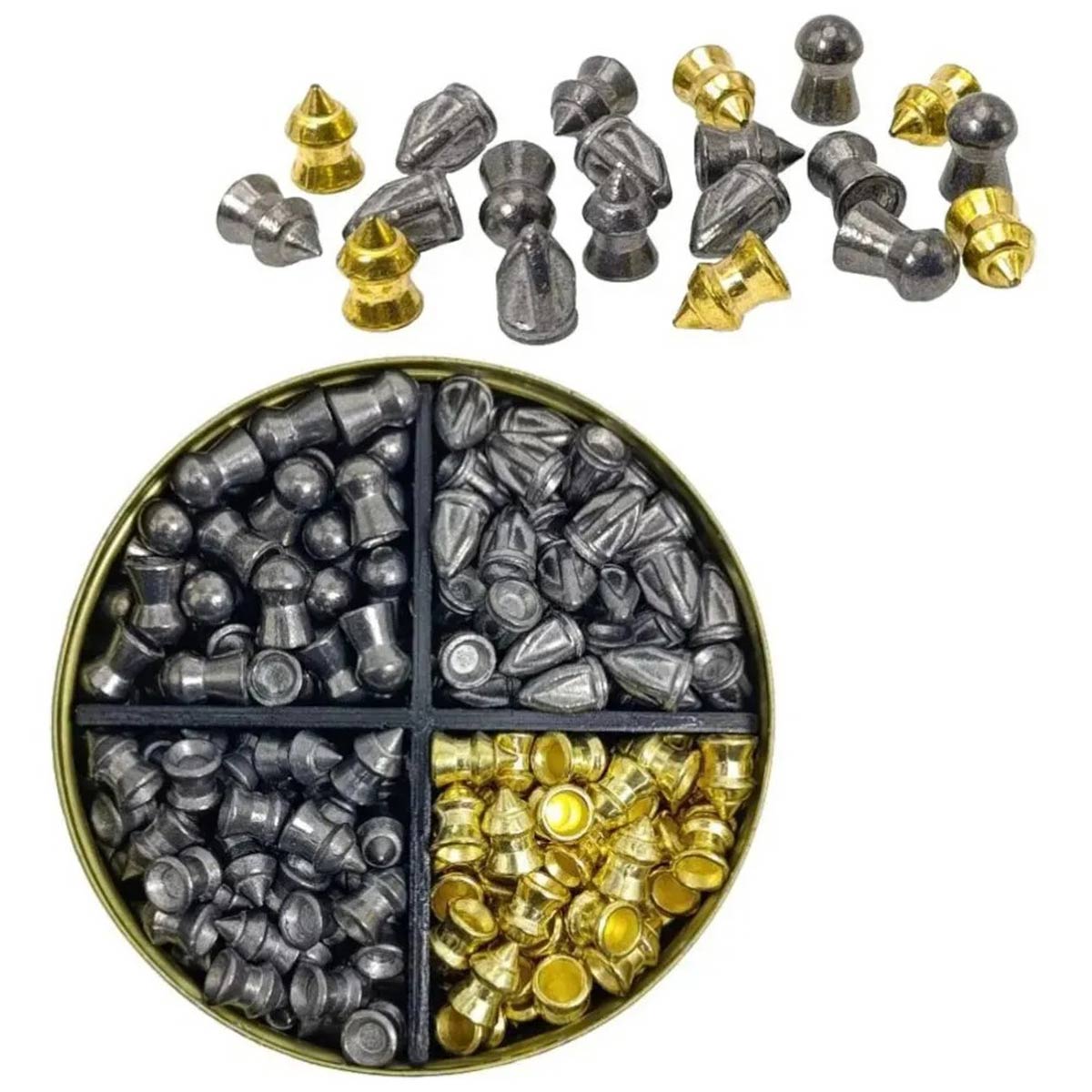 A embalagem em lata resistente com divisórias internas facilita a organização e o transporte, mantendo os chumbinhos protegidos e separados por modelo.