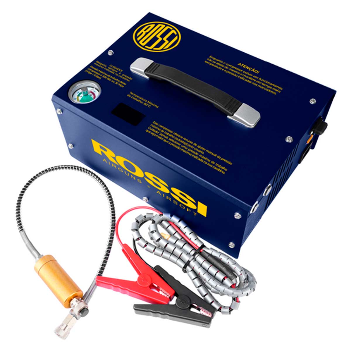 O Compressor Portátil 12V Rossi Auto Stop 300 Bar Bivolt foi desenvolvido para oferecer praticidade, autonomia e segurança no enchimento de cilindros de alta pressão, sendo ideal para carabinas PCP, paintball e outros equipamentos que utilizam ar comprimido.