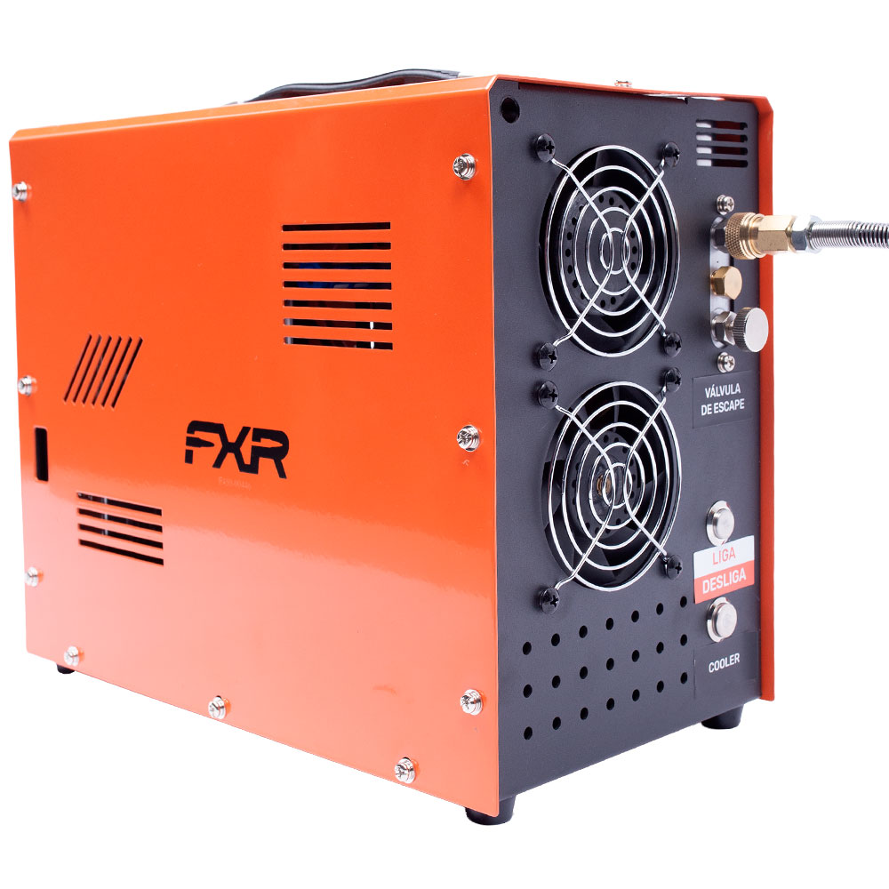 O Compressor Portátil FXR Trivolt Auto-Stop 2 Cooler é a versão aprimorada do compressor portátil para PCP que une potência, segurança e praticidade: com motor de 350W e dois coolers integrados, melhora a refrigeração e reduz o risco de superaquecimento durante ciclos longos, permitindo recargas mais seguras e duráveis. Projetado para operar em 12V, 110V ou 220V graças ao conversor interno, ele enche cilindros de referência de até 1 litro e atinge pressão máxima de 300 bar (4500 psi / 30 MPa), com capacidade de encher 0,5 L em cerca de 13 minutos. A função Auto-Stop possibilita programar a pressão desejada para que o compressor desligue automaticamente ao alcançá-la, evitando sobrecarga e facilitando o uso por quem recarrega em casa ou em campo. O equipamento trabalha sem óleo e sem necessidade de resfriamento externo por água, vem com mangueira e kit de acessórios, e oferece operação intuitiva, são baixos níveis de manutenção. Compacto e portátil, é indicado para atiradores e praticantes que precisam de uma solução rápida, segura e confiável para manter cilindros PCP sempre prontos para uso.