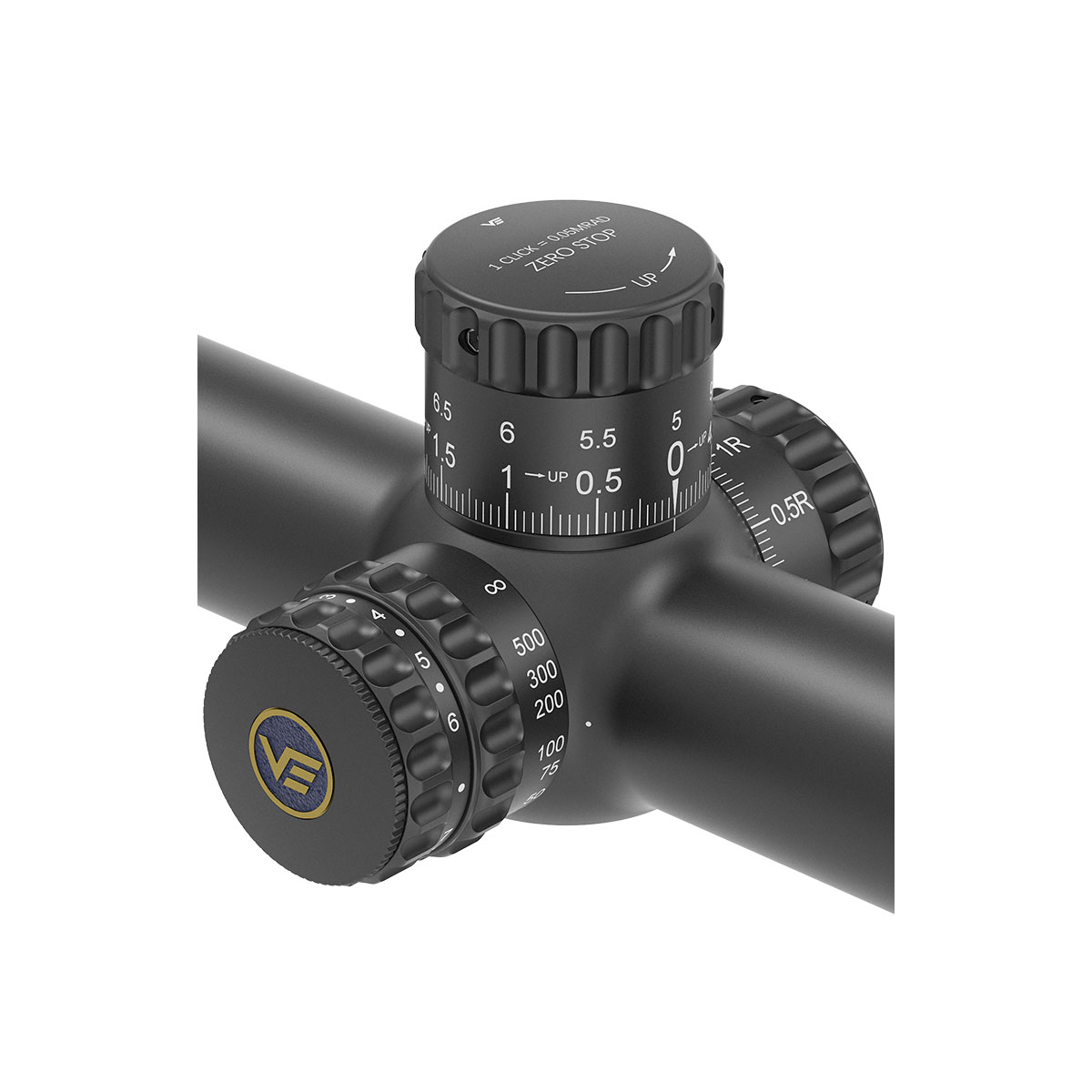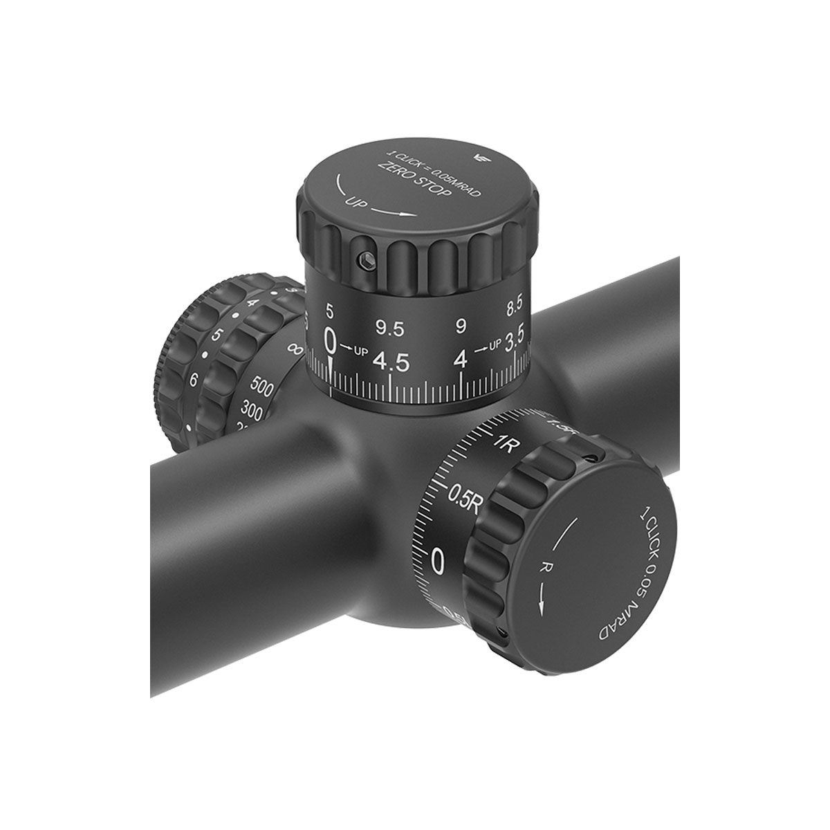 As torres desta luneta oferecem um ajuste duas vezes mais fino que o padrão de 0.1 MIL. Cada clique move o ponto de impacto em apenas 5 milímetros a 100 metros, permitindo um ajuste de zero extremamente preciso e correções mínimas, essenciais para competições de agrupamento.