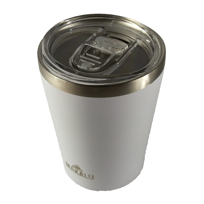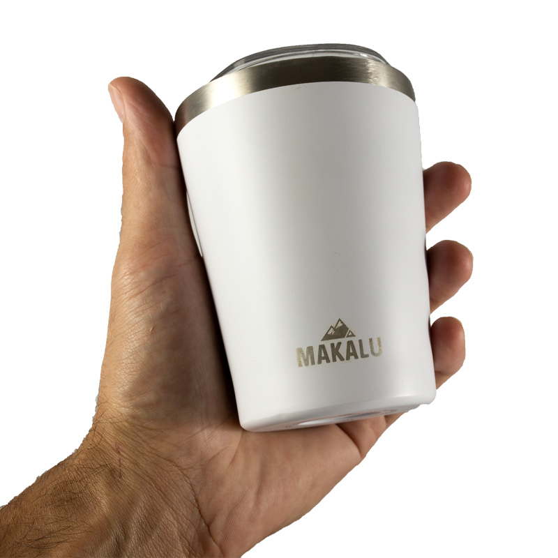 Isolado a vácuo com parede dupla e revestido de aço inoxidável o copo Makalu garante até 4 horas de preservação da temperatura, seja ela quente ou fria. Possui tampa de plático removível e pesa cerca de 170g.