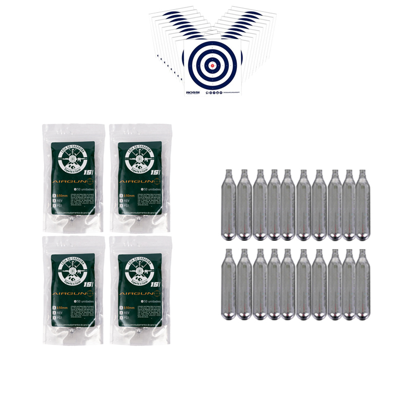Combo imperdível feito pela LojaDaCarabina para você complementar sua arma .50! Contém 4 Potes de Esferas de Alumínio .50 com 50 unidades cada, para que você possa municiar sua .50, 20 Cilindros de CO2 para que você possa impulsionar seus disparos e Alvos de Treino Rossi.