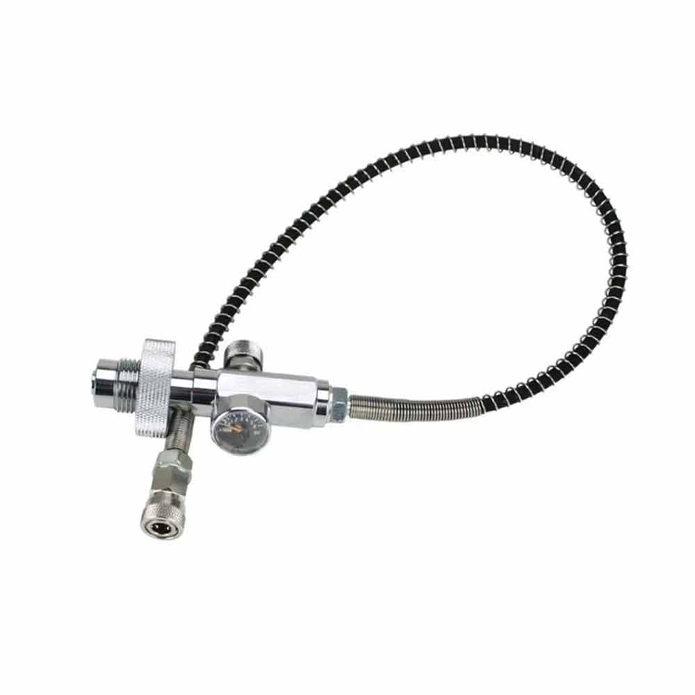 Equipada com um manômetro de fácil leitura (escala 0-5000 PSI / 0-350 BAR), você monitora a pressão exata sendo transferida. A conexão é do tipo DIN G5/8 (Macho), compatível com a vasta maioria dos cilindros de mergulho modernos. A mangueira capilar de 49 cm possui revestimento de mola em aço para evitar dobras e estrangulamentos, terminando em uma rosca 1/8 BSP Fêmea (padrão para conectar o fill probe da sua arma ou engates rápidos Foster).