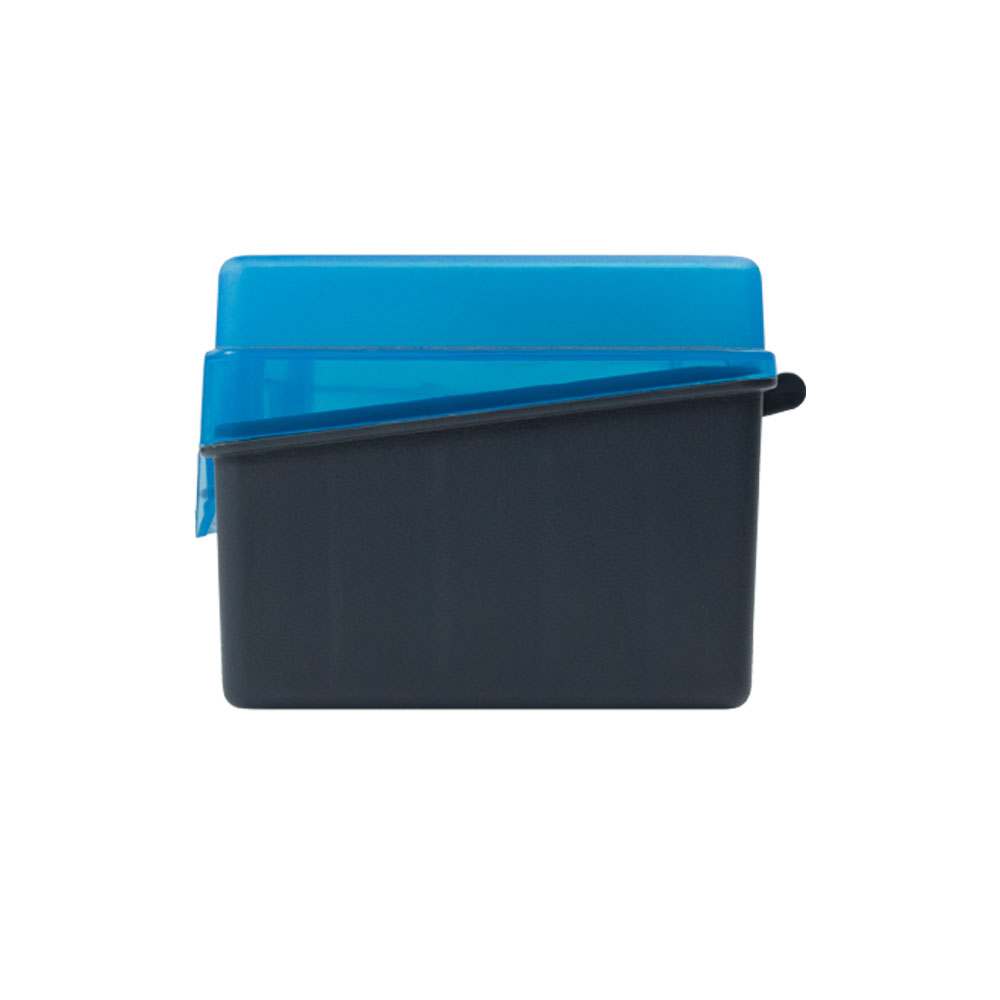 Caixa em polímero com tampa transparente na cor azul e base na cor cinza escuro.