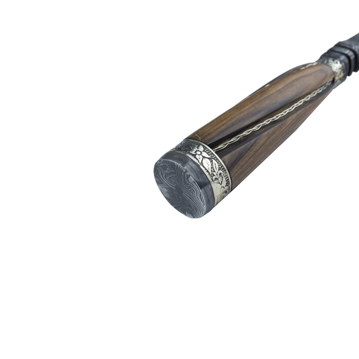 O cabo é retovado em madeira guajuvira que tem uma estética muito bonita! E ainda possui detalhes feitos a mão em alpaca nas duas pontas do cabo. Esses detalhes são muitos bonitos e impressionam!
