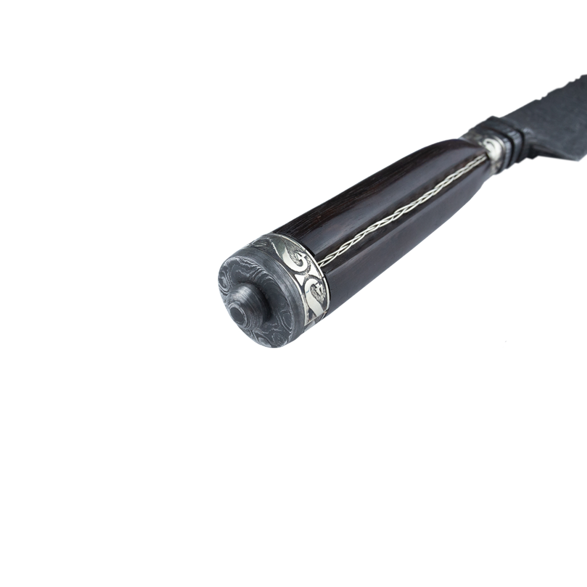 Conta com dorso mosqueado e pomo em aço damasco.