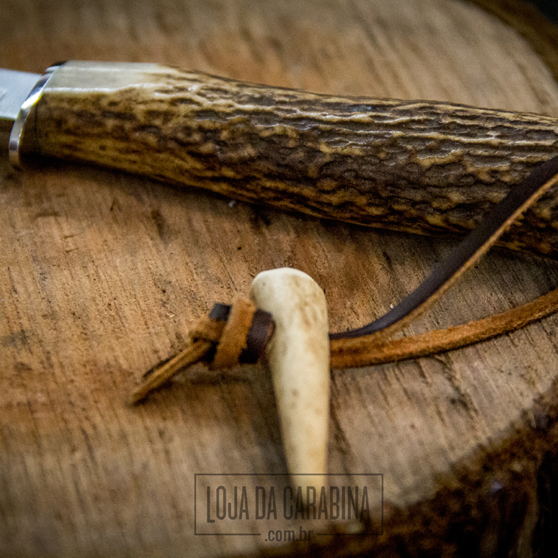 É uma faca com lâmina produzida em Molibdênio Vanádio, cabo inteiriço com chifre de cervo europeu e guarda mão de bronze.