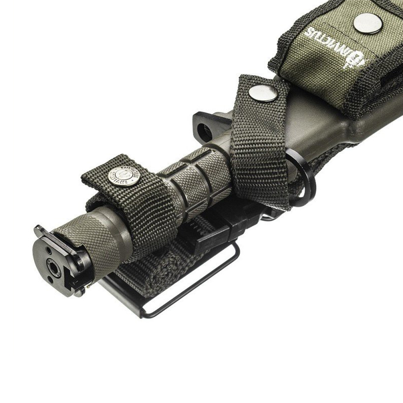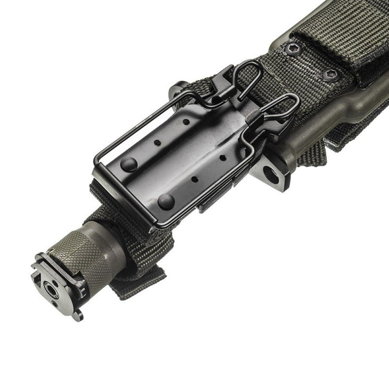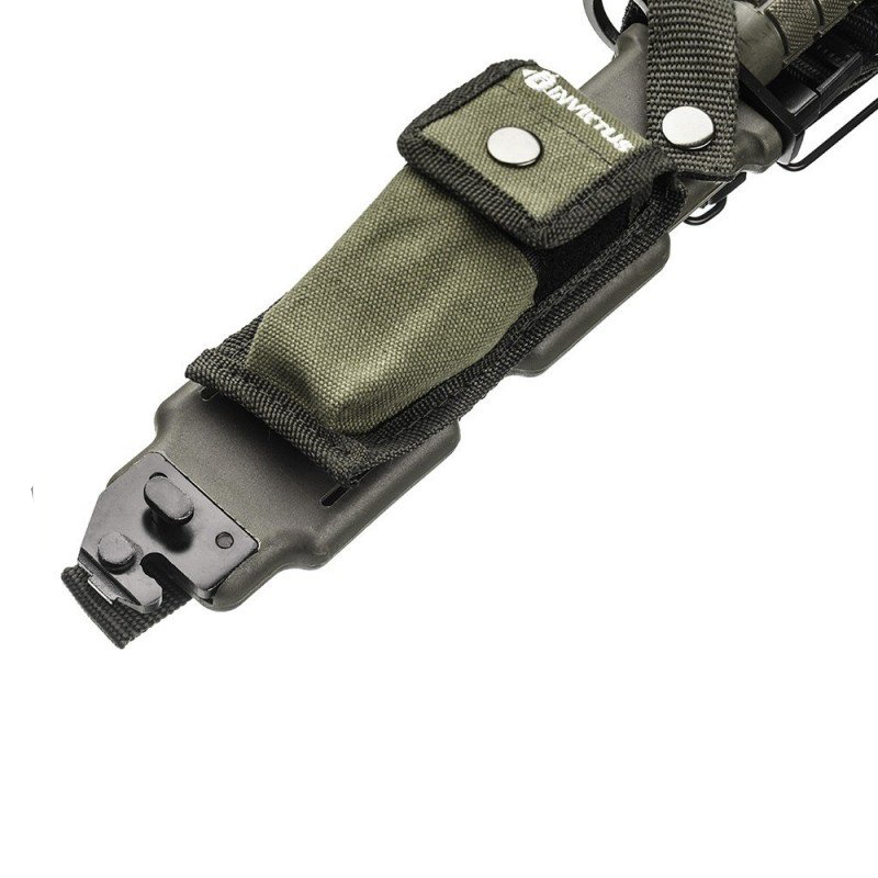 Bainha em polímero com múltiplas funcionalidades - bolso destacável, alças em nylon, passador de cinto, alavanca corta arame, presilha de saque rápido e pedra de amolar