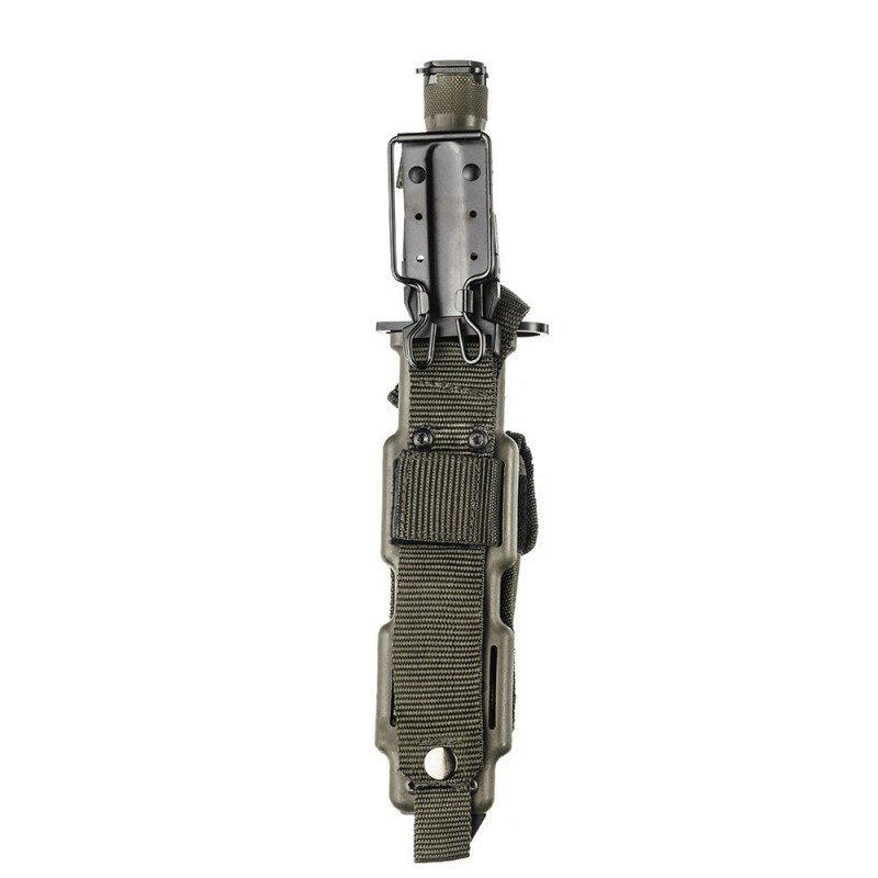 Sistema de fácil encaixe (permite acomodar a faca em qualquer posição), alavanca corta arame, bolso destacável, pedra de amolar, prendedores de nylon, passador de cinto e presilha de saque rápido. Para completar, é feita de polímero de alta resistência.