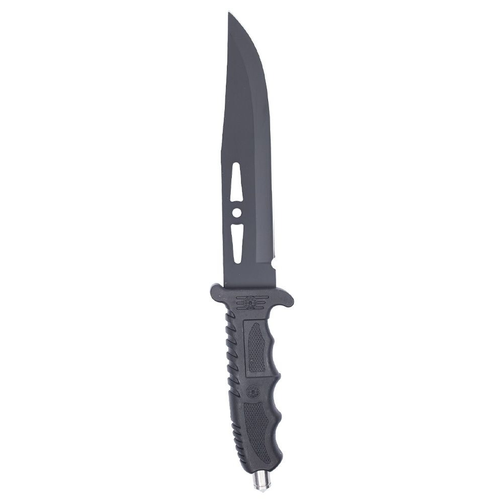 O seu cabo é feito de ABS rígido e coberto com borracha antiderrapante, garantindo uma pegada muito firme e confortável, mesmo com as mãos molhadas. É nele que estão as funções multiuso desta faca: Bússola integrada no guarda-mão e pomo de metal.