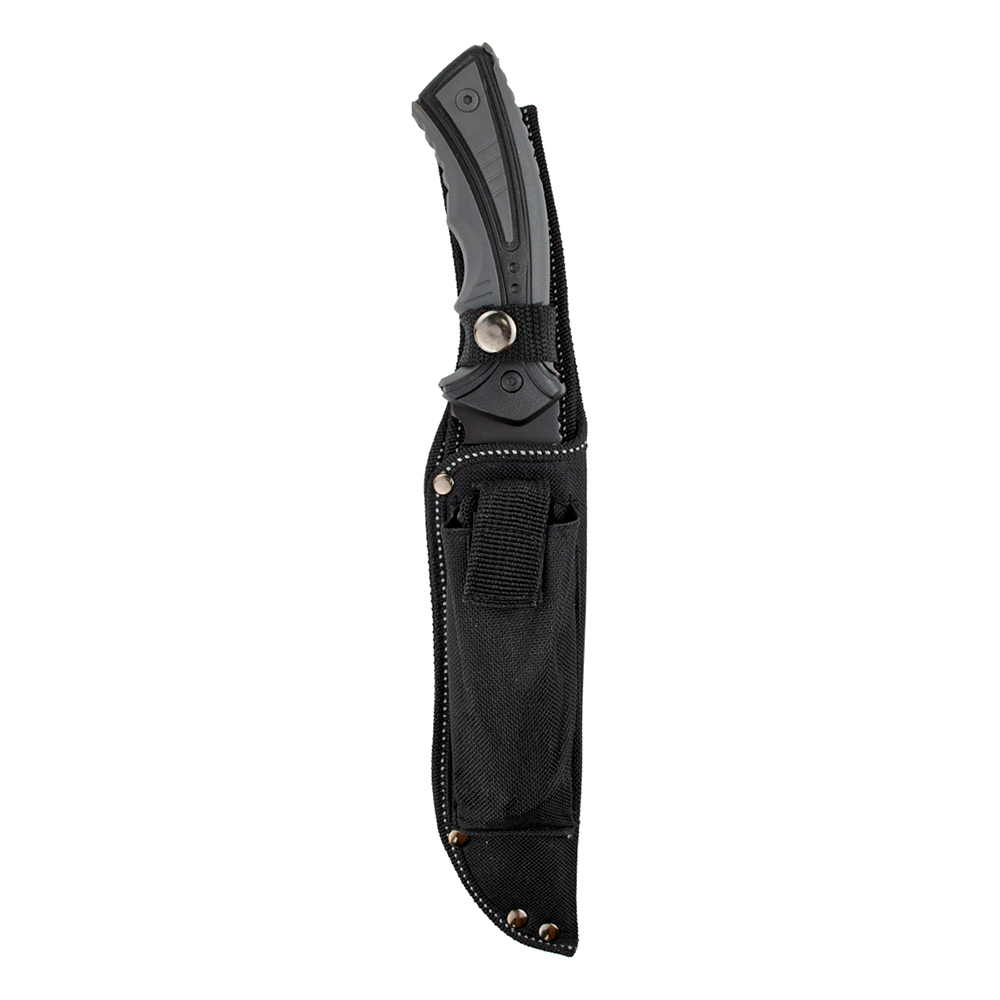 A bainha preta que acompanha tem compartimento central para a faca com fechamento por botão de pressão e um superior para o canivete com fechamento por velcro.
