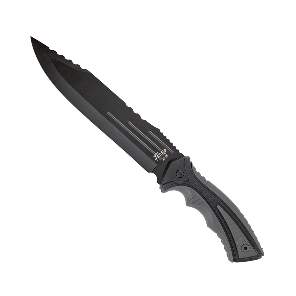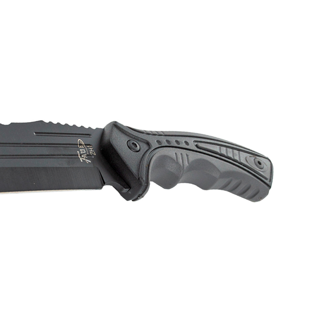 A faca possui lâmina em aço na cor preta e um cabo emborrachado que oferece uma empunhadura super firme e confortável.