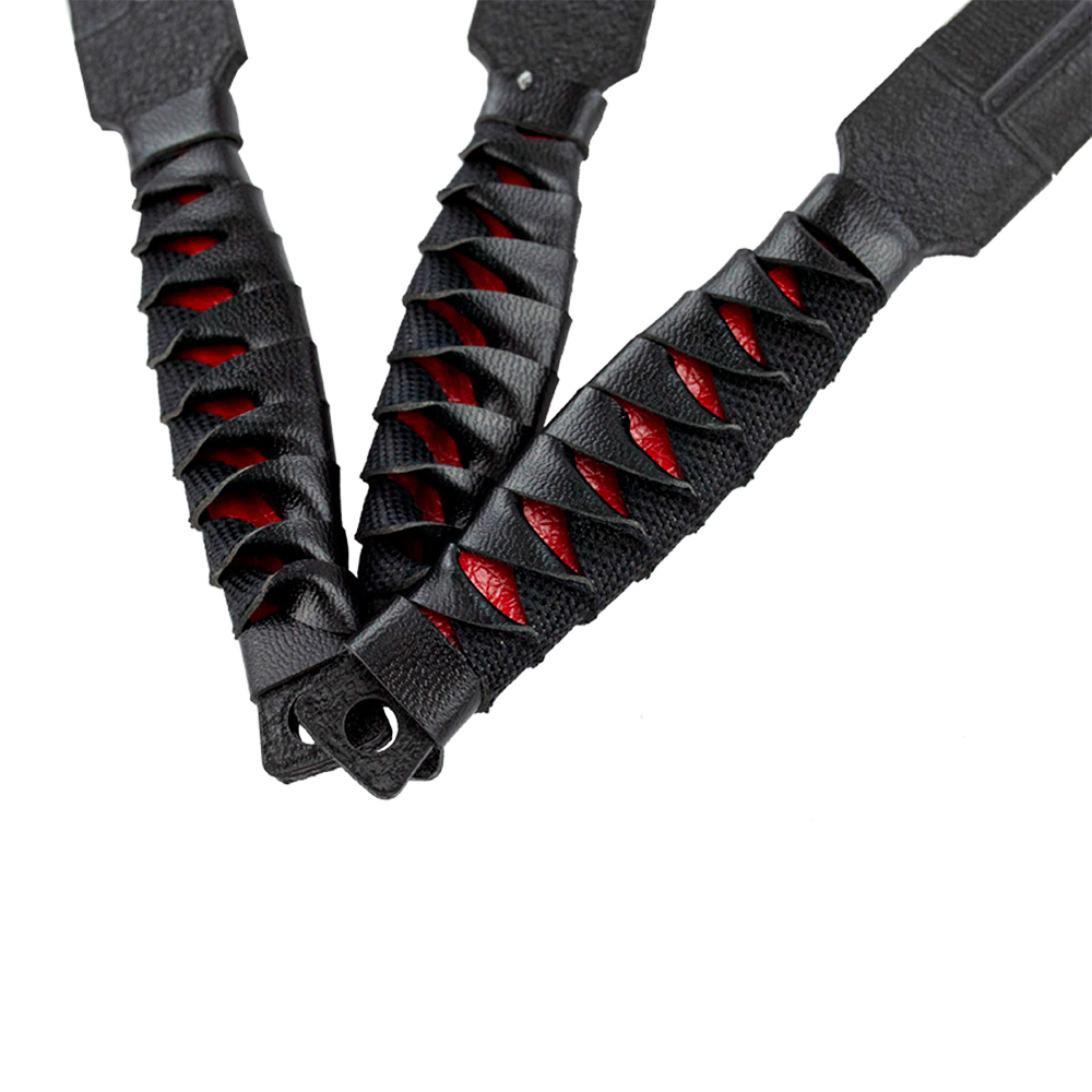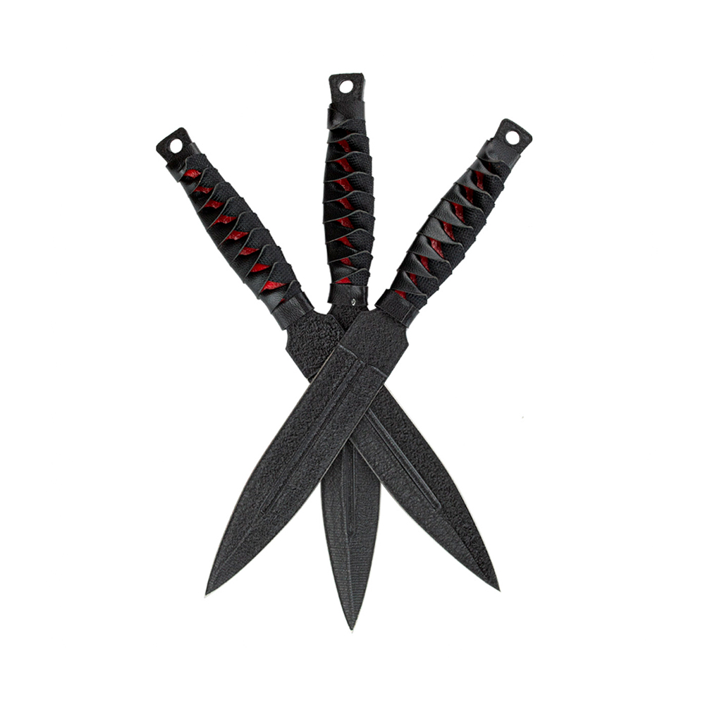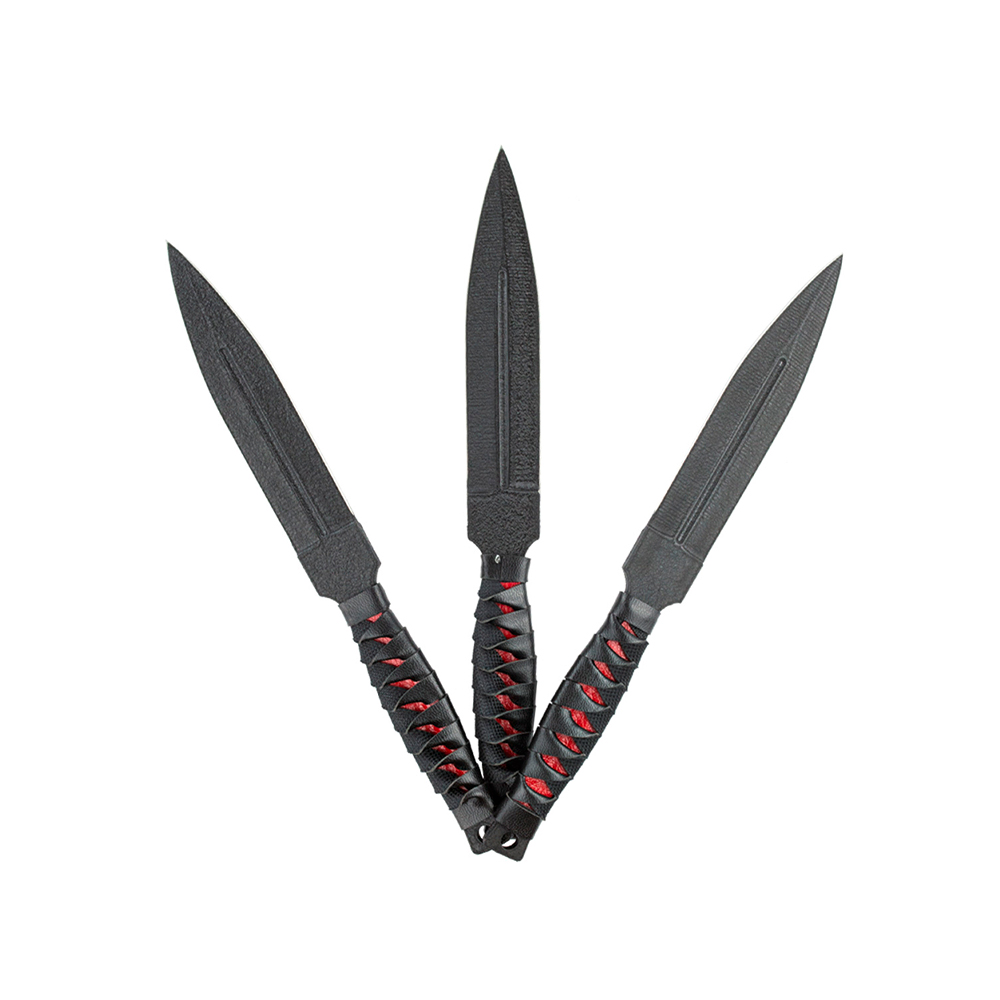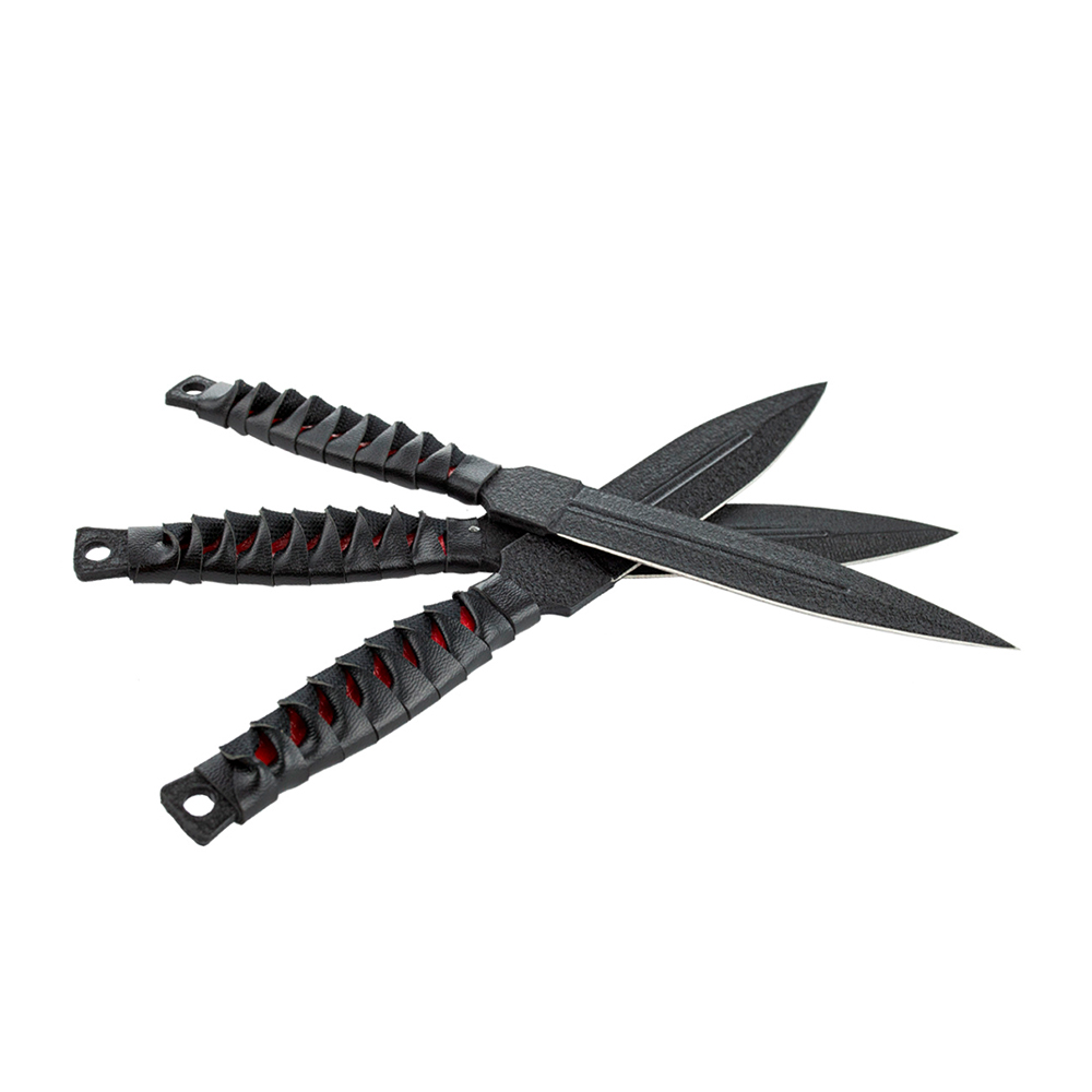 Kit com 3 facas de arremesso esportivas com lâminas em aço e cabo com couro sintético trançado.