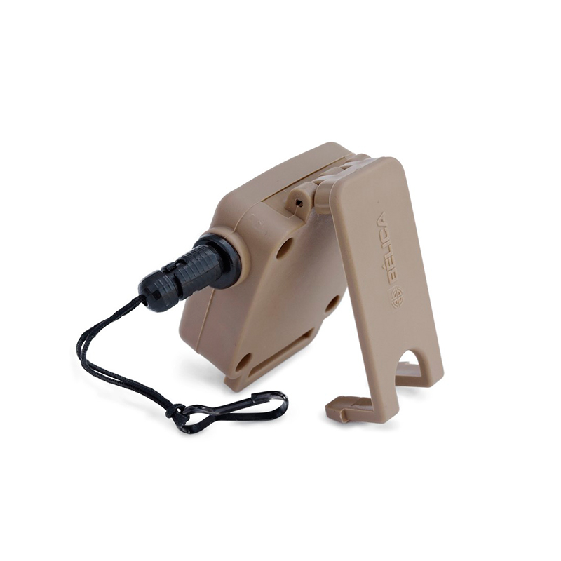 Possui gancho na ponta do cordão para prender a arma evitando acidentes
