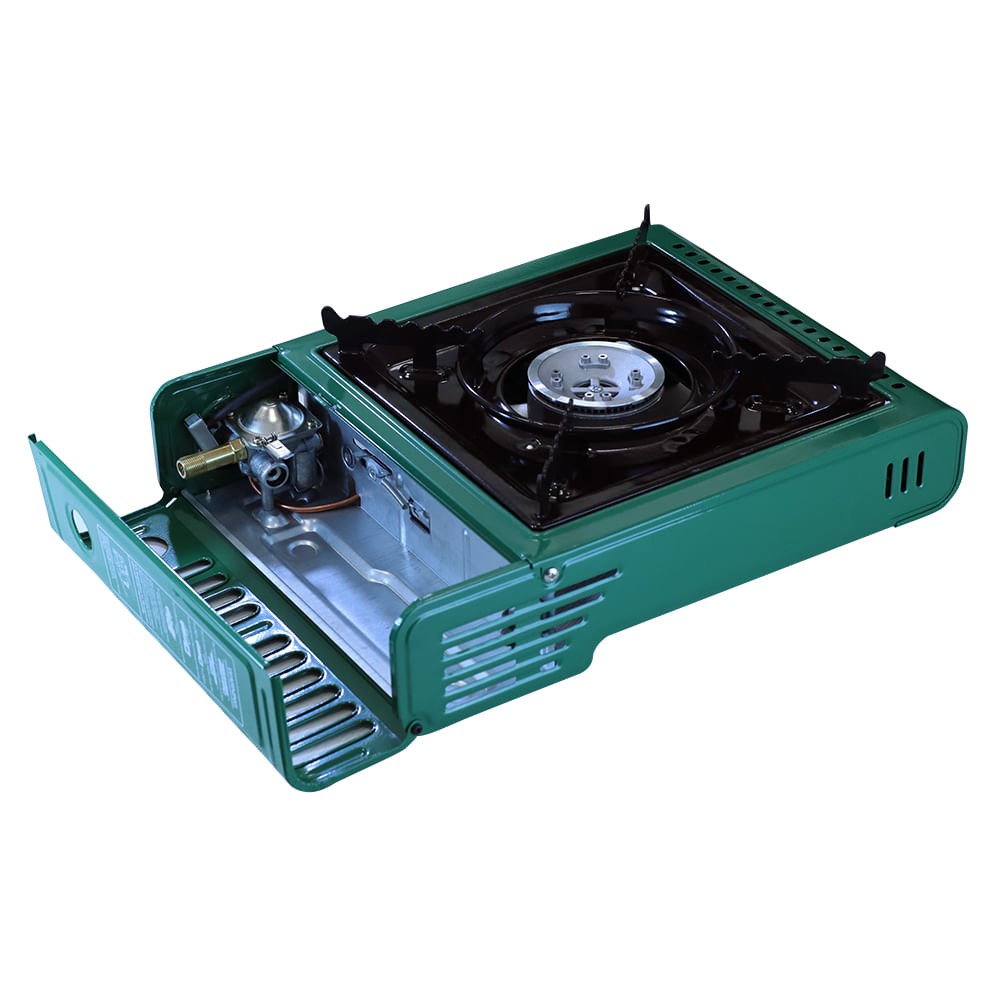 Equipado com válvula de segurança que permite engate e desengate do cartucho de gás sem vazamentos e corta chama que desliga o fogareiro em caso de movimentos bruscos.