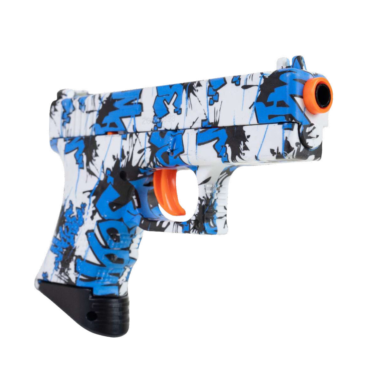 Pistola de Gel Rossi, modelo Glock R17 com design camuflado nas cores branco, azul e preto.