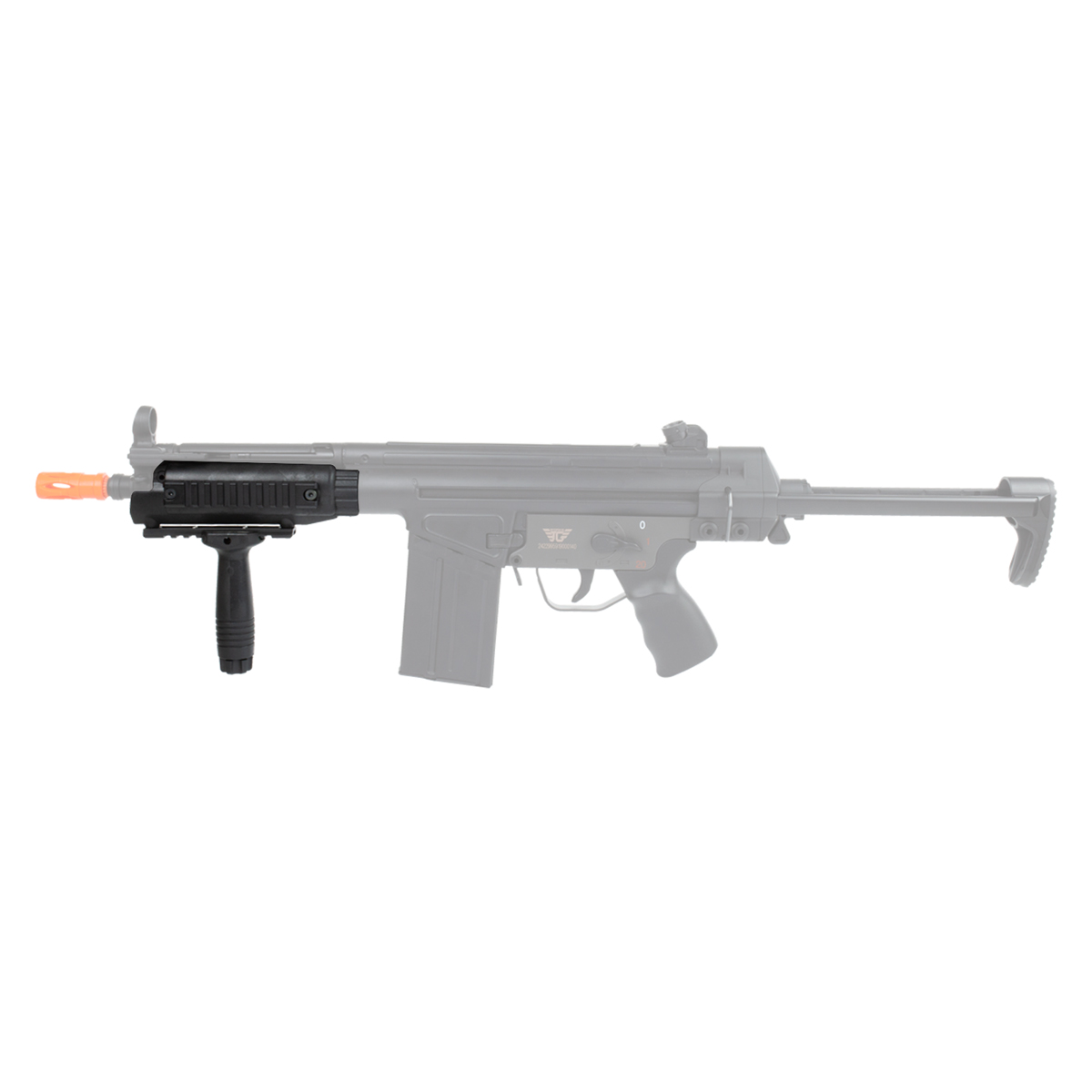 Esse HandGuard é uma peça de reposição para Rifle Airsoft MP5, fabricado em polímero de alta densidade e com 3x trilhos RIS 20mm em metal, onde você pode instalar diversos acessórios, como miras, grip, lanterna, apoio de dedo, etc.