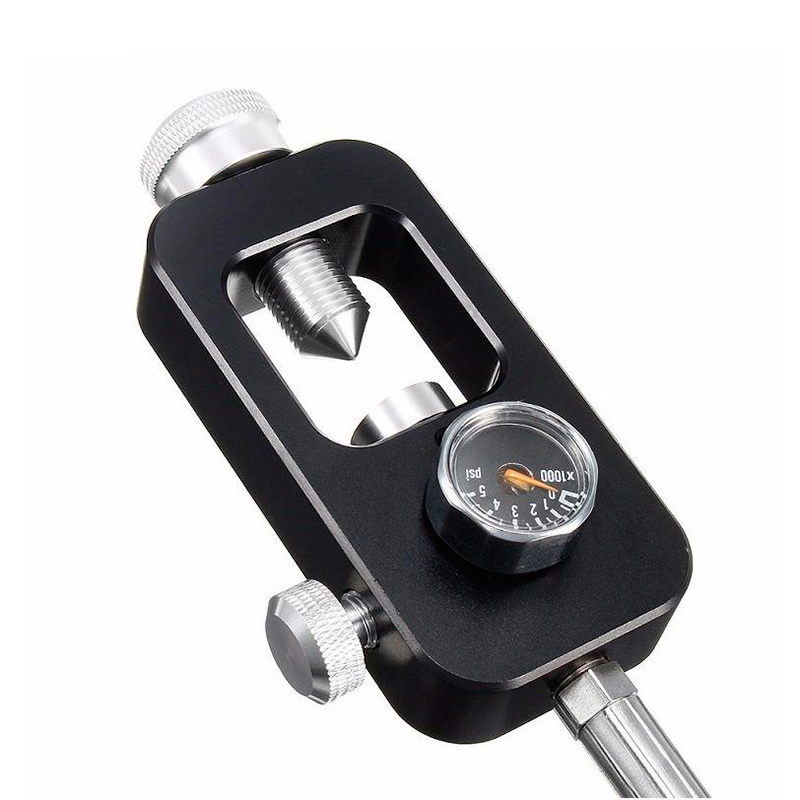 Confeccionado em alumínio, acabamento anodizado, equipado com manômetro de 0-5.000 PSI.
