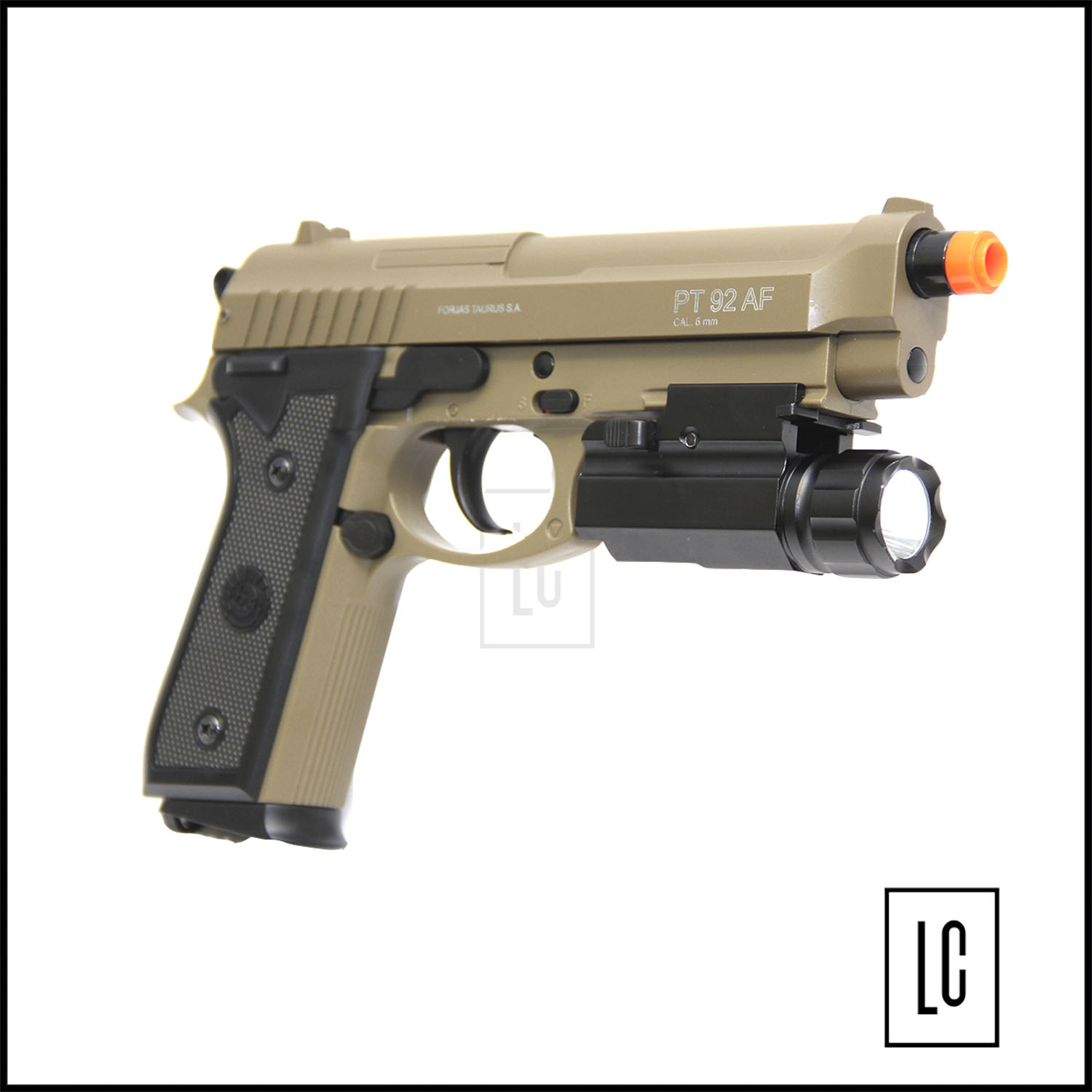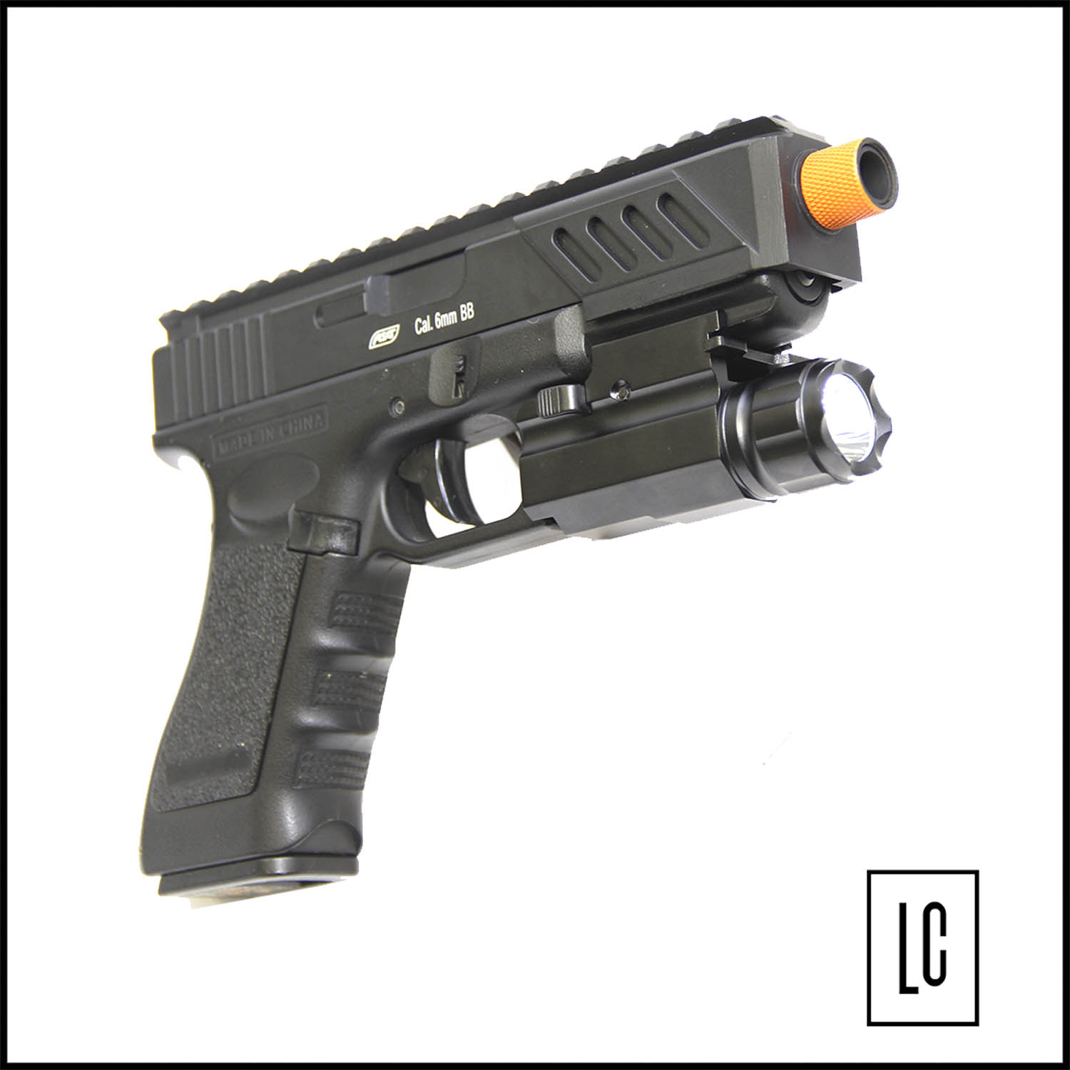 Seu acionamento é realizado pela parte lateral da lanterna, com um simples clique para o lado para acioná-la e para o outro para desliga-la, desta forma, empunhando a pistola com as duas mãos, o operador tem, ao alcance de seus dedos, o acionamento tático da lanterna.