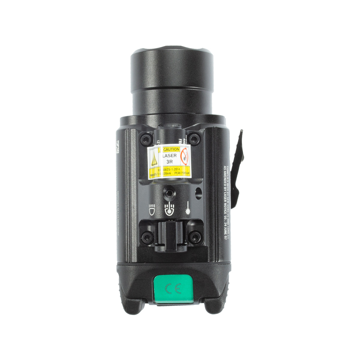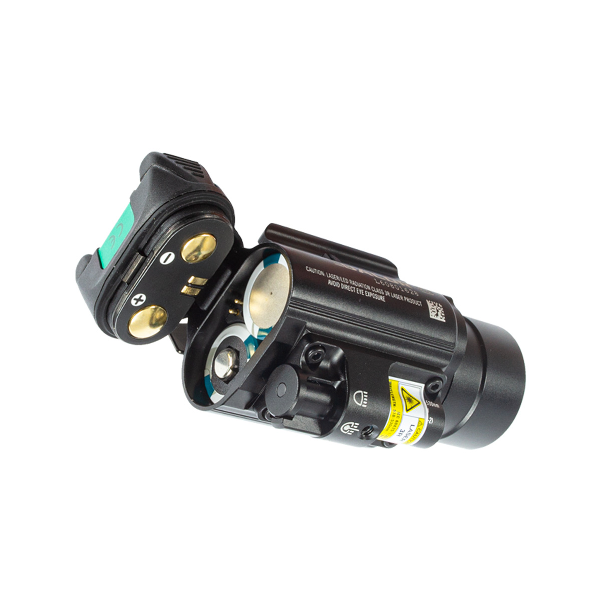 A BALDR PRO possui três configurações de luz disponíveis! É possível escolher entre apenas LED branco, somente laser verde ou a combinação de LED branco + Laser verde juntos. Para alternar entre os modos de operação basta utilizar o interruptor giratório da lanterna.