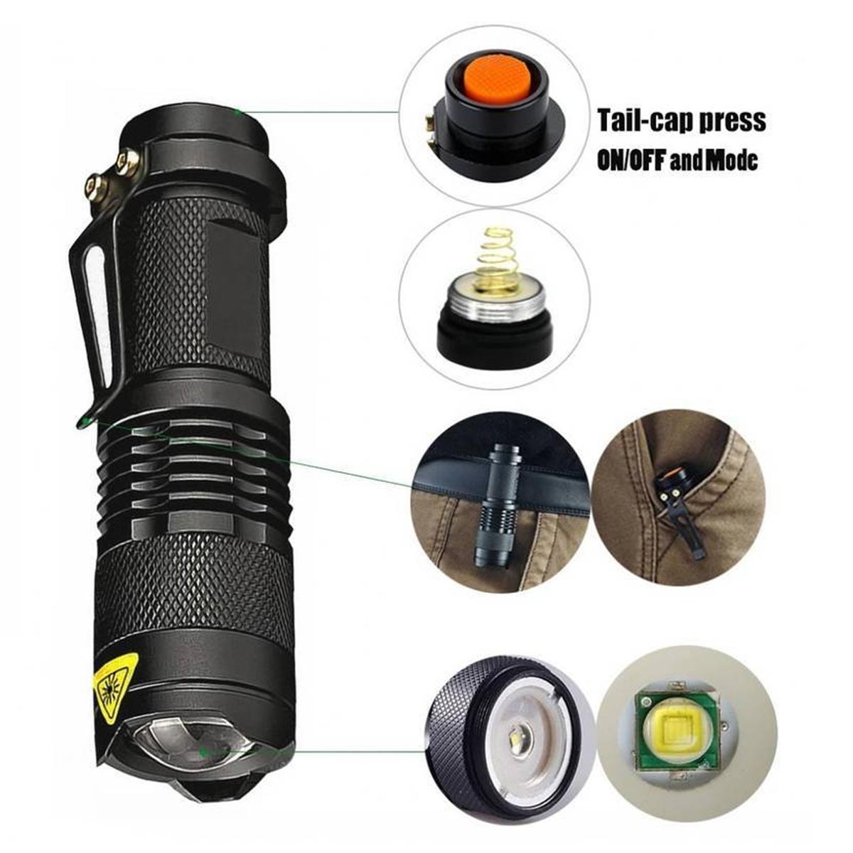 - 3 Níveis de luz: Forte, Baixa e Emergência piscante Zoom facilmente ajustável, Utiliza 1 bateria de litio 14500.
