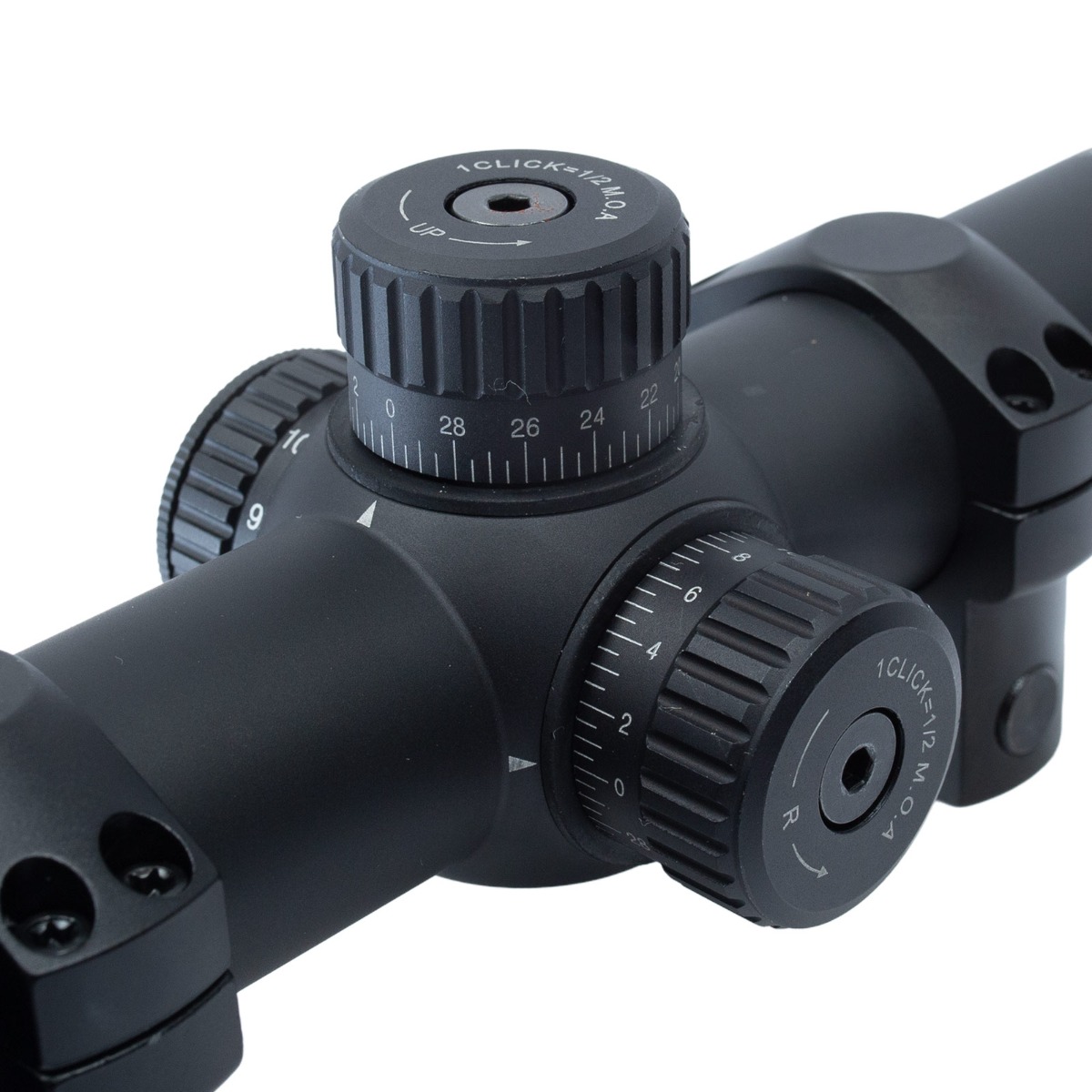 O ajuste é feito em MOA, sendo de 1 click = 1/2 MOA. Sendo assim, a cada dois clicks na torre (vertical ou horizontal) equivale a 1 MOA.