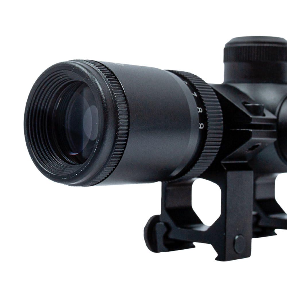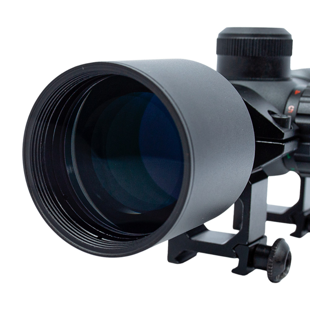 Possui faixa de zoom de 3x a 9x com uma objetiva de 40mm e lentes multi-revestidas, proporcionando uma imagem clara.