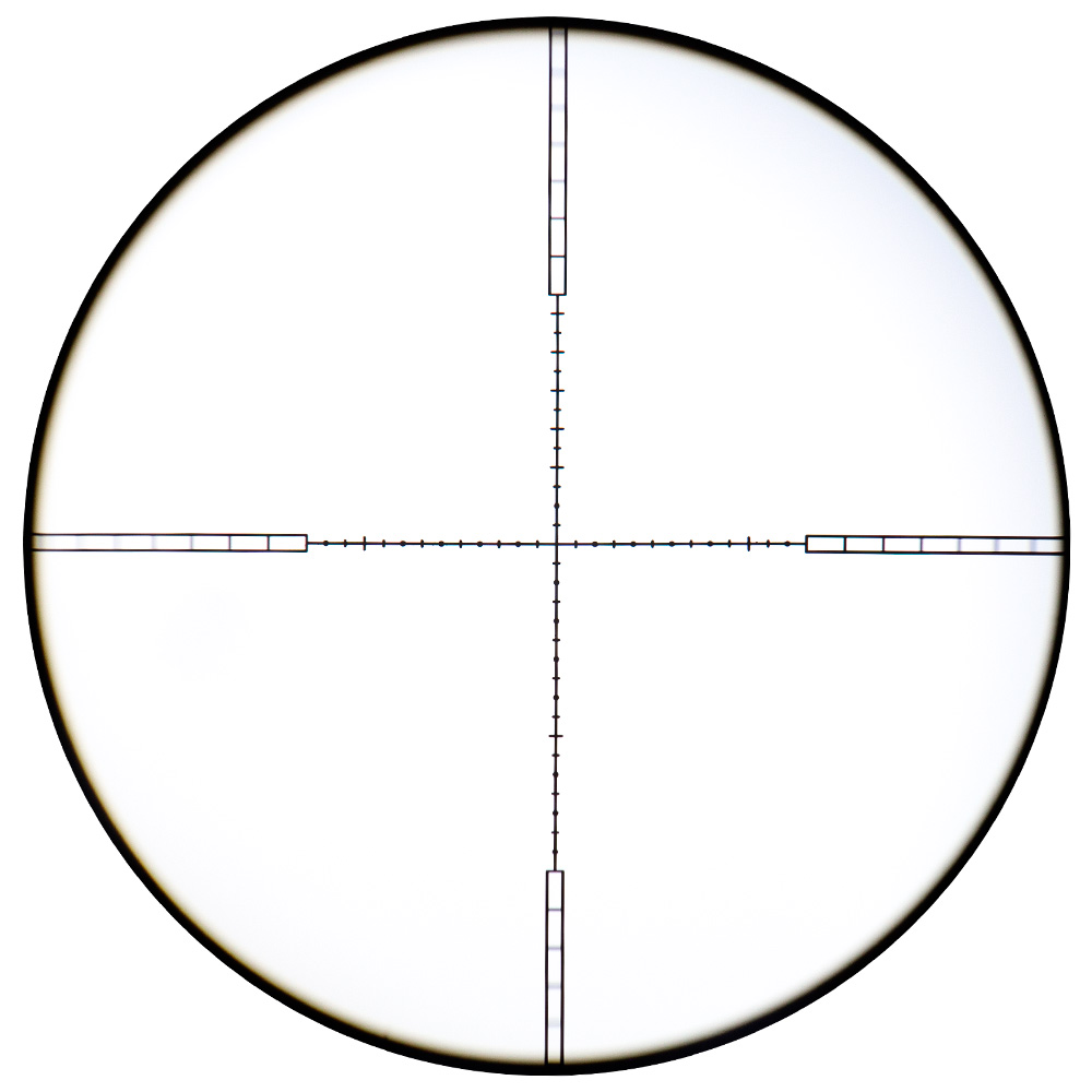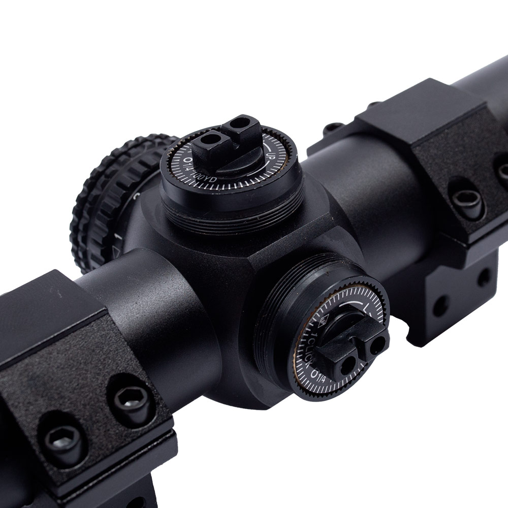 Torres de Ajuste (1/4 MOA): As torres de ajuste vertical e horizontal possuem cliques táteis e audíveis. Cada clique move o ponto de impacto em 1/4 de MOA (Minute of Angle), o que equivale a aproximadamente 1/4 de polegada a 100 jardas (ou ~7mm a 100 metros). A faixa total de ajuste é de 40 MOA para cada eixo. Uma grande vantagem é que o ajuste pode ser feito manualmente, sem a necessidade de ferramentas.