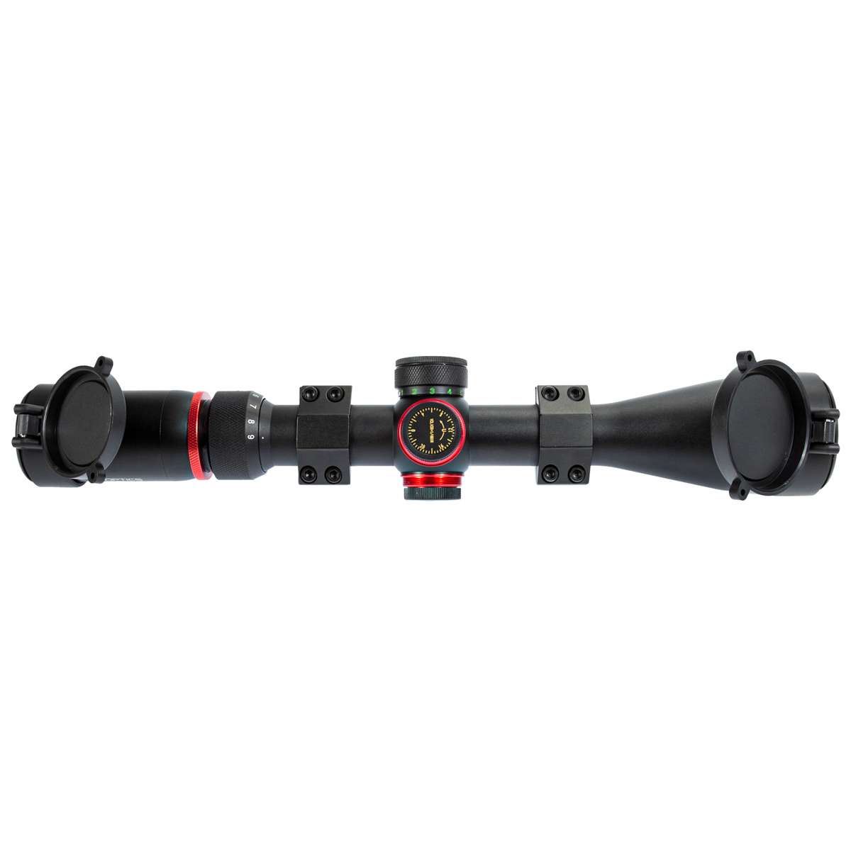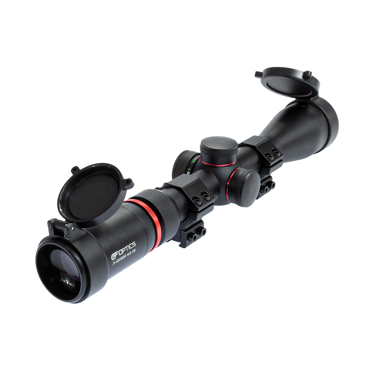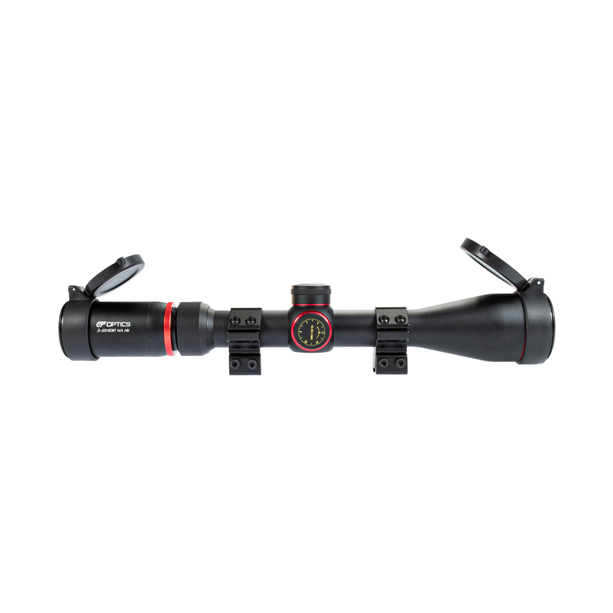 Luneta 3-9x40 IR fabricada em alumínio de aviação com zoom ajustável de 3x até 9x e objetiva de 40mm. Na cor preta, com detalhes em vermelho.