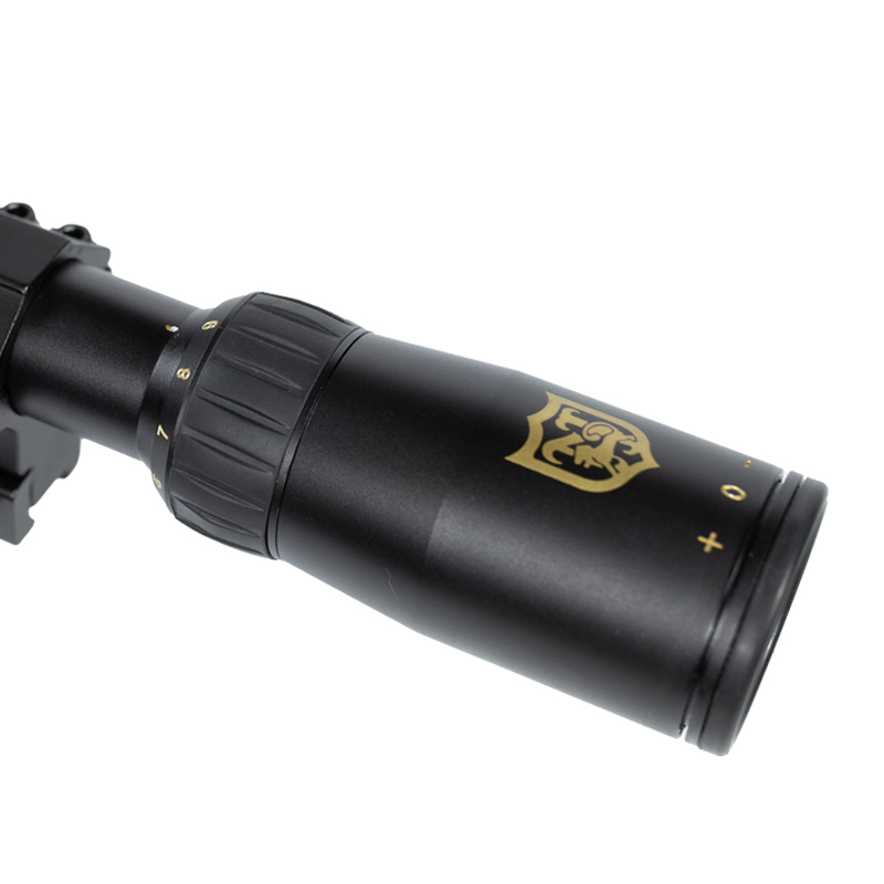 Possui ajuste de paralaxe que começa em 10m e vai até o infinito. O ajuste de paralaxe serve para medir a distância do alvo até você, e assim possibilitar o cálculo de compensação para o disparo certeiro.