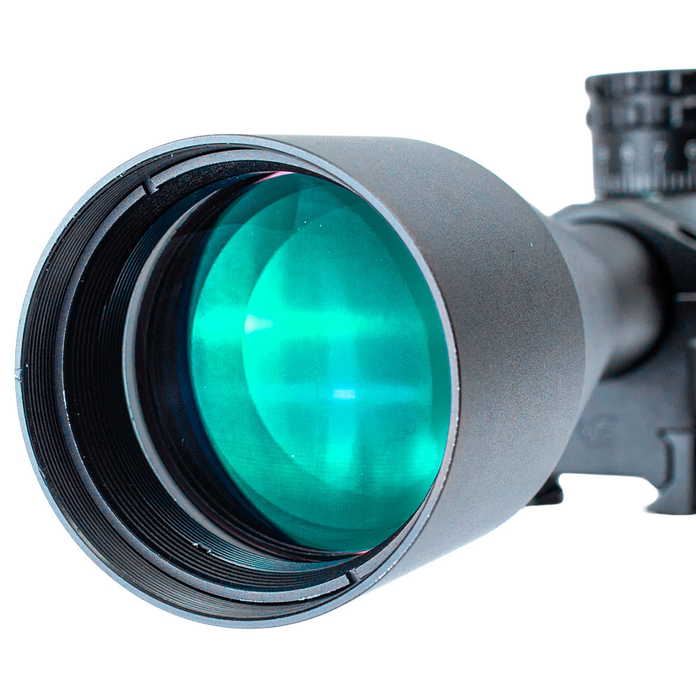 A configuração SFP é frequentemente preferida por muitos atiradores por manter a espessura do retículo constante em qualquer nível de zoom. Isso garante que a mira não obstrua o alvo em altas magnificações, facilitando a visada de precisão. O retículo BDC (Compensador de Queda Balística) foi otimizado para uso em 10x de magnificação, fornecendo referências rápidas e intuitivas para compensar a trajetória do projétil em distâncias de até 600 jardas. Para visadas em condições de baixa luz, o retículo possui iluminação vermelha com 11 níveis de intensidade.